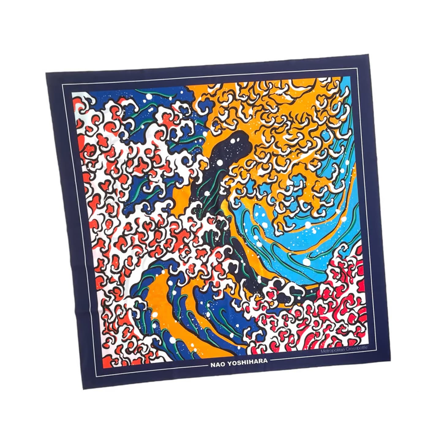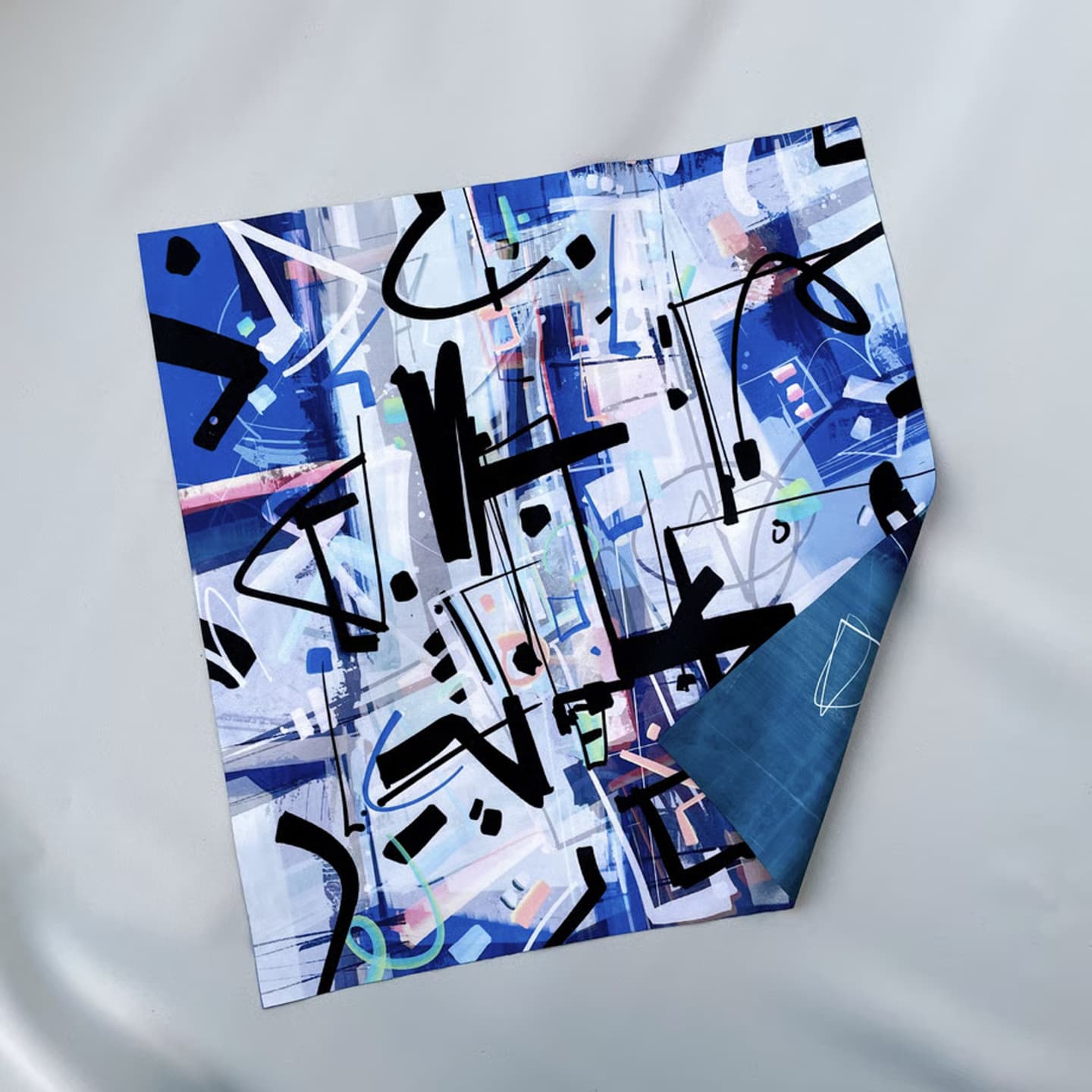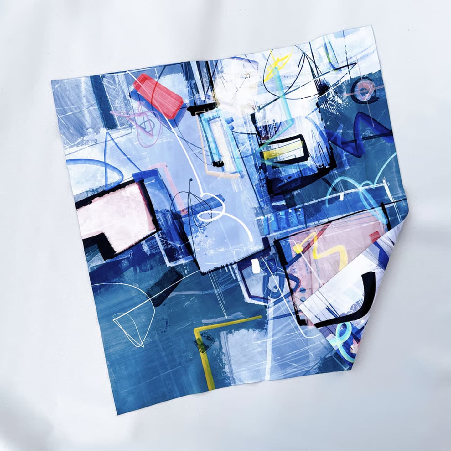 この布地には表面も裏面もありません。ダブルフェイスで、二面でアートを楽しめます。アート(デザイン)の原画を忠実に表現するために最高峰の印刷技術により、鮮明な色合いの表現に成功しております。紙とは違う質感がまた特別な感覚でアートの世界観を感じられます。四つ角を引っ張りスカーフアートのように飾るのもいいですし、額装もオススメします。