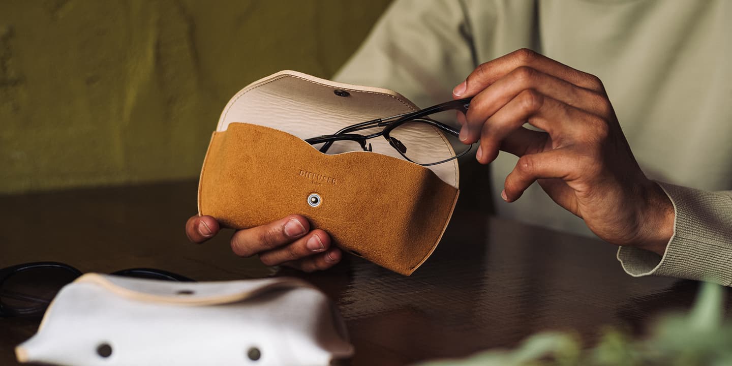「人工スエードとヌメ革を組み合わせたセミハードケース」