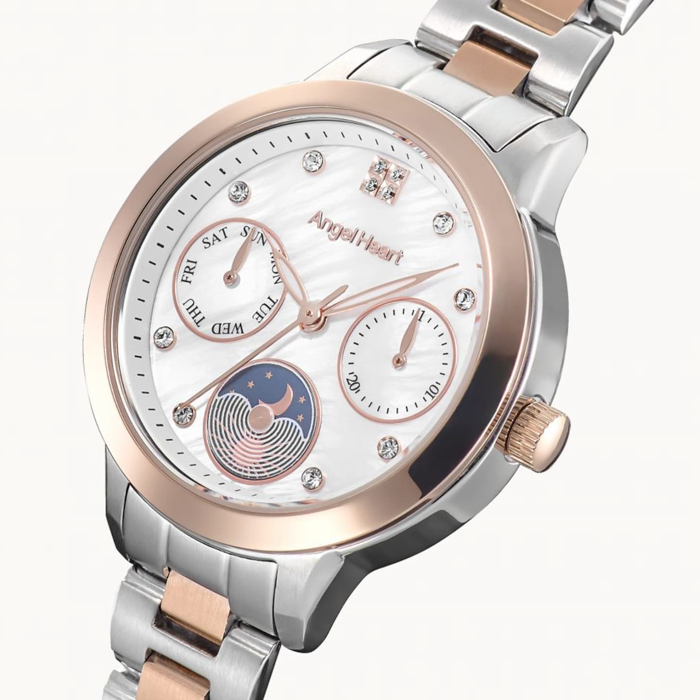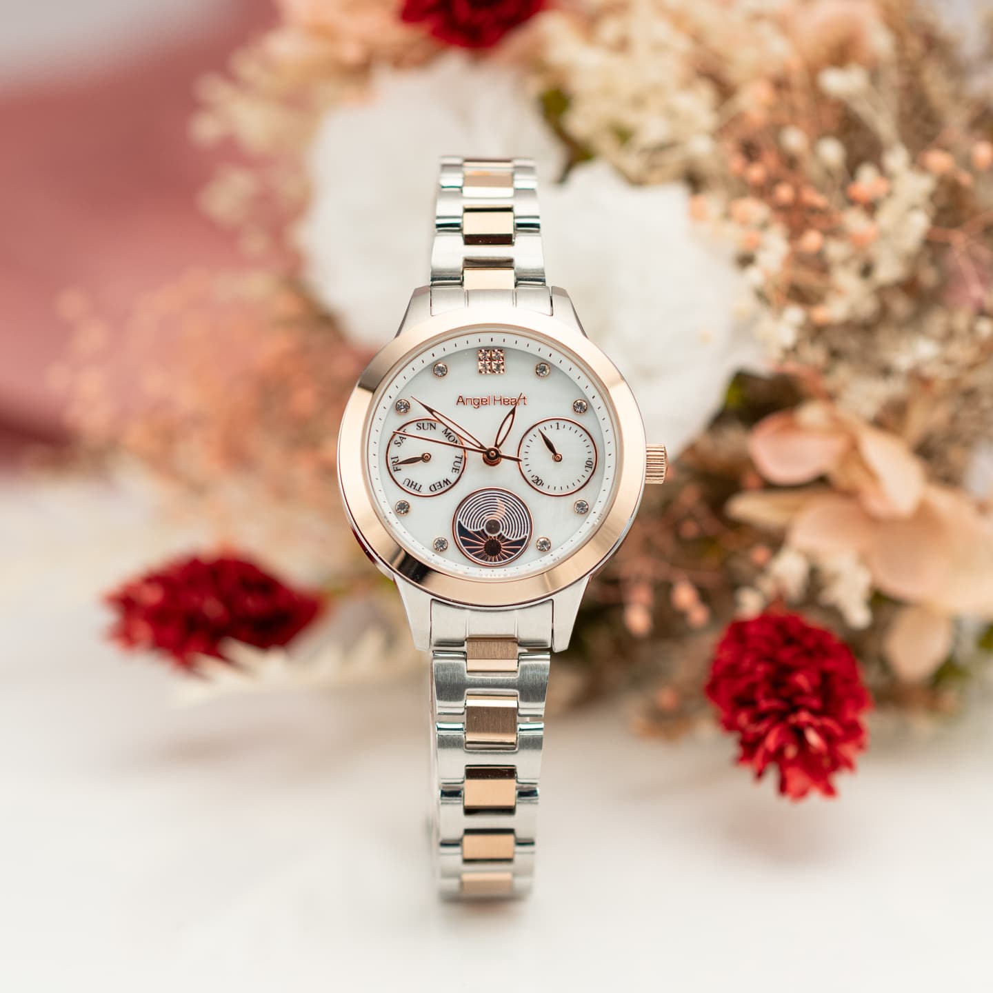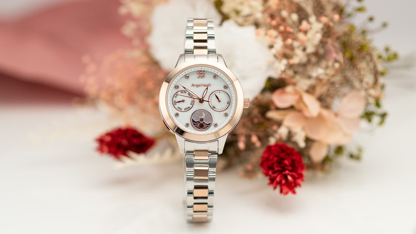 20周年記念秋冬コレクションとしてサン&ムーンが特徴の『Innocent Time』シリーズが登場。一番星に見立てたクリスタル4粒を12時位置に施し、サン&ムーンと相まってロマンチックなデザインに。また、時間の読み取りを容易にする60目盛りと便利な曜日・日付表示を搭載と、機能面にも優れています。日本製ムーヴメントを使用しており、アフターサービスも充実。初めての腕時計デビューや、大切な方へのプレゼントに安心してお選びいただける1本です。
