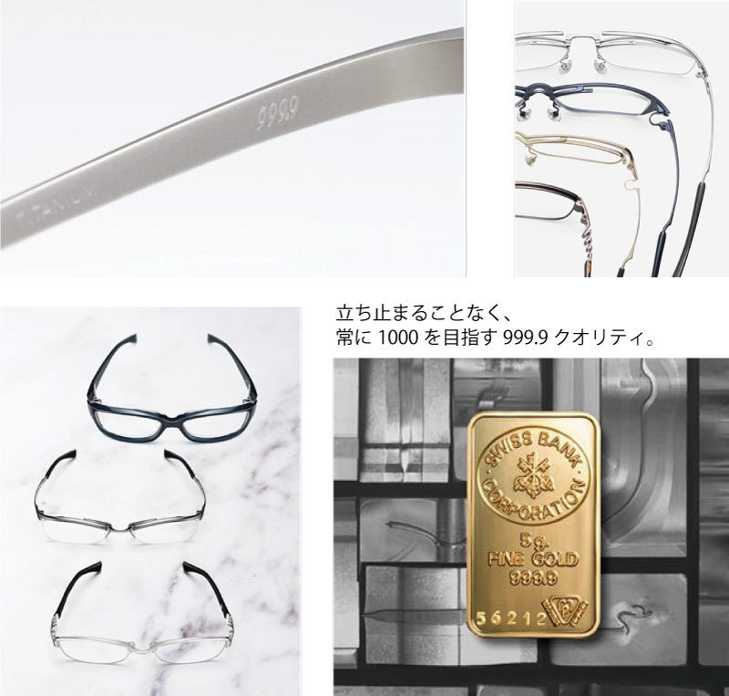 999.9(フォーナインズ)は、1995年に誕生した 日本のアイウェアブランドです。 純金の品質表示に由来するそのブランド名には、 常に最高純度の品質を目指して努力し続けるという意味がこめられています。 「眼鏡は道具である。」をコンセプトに、 掛けやすい、壊れにくい、調整しやすいといった、 視力矯正器具に求められる機能を磨き上げることで、 高い機能性と美しいフォルムを表現するフレームを生み出してきました。 フォーナインズは、常にさらなる可能性を模索し 最高純度のクオリティを追求し続けています。