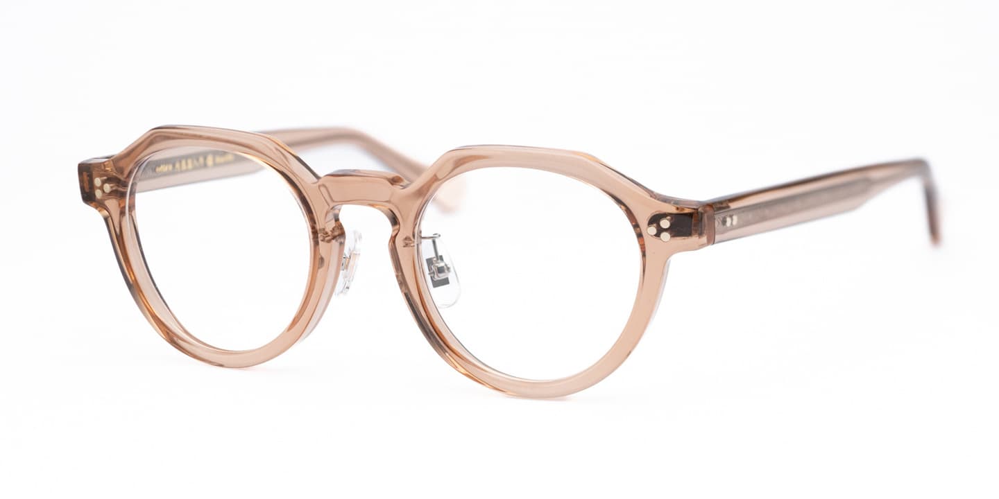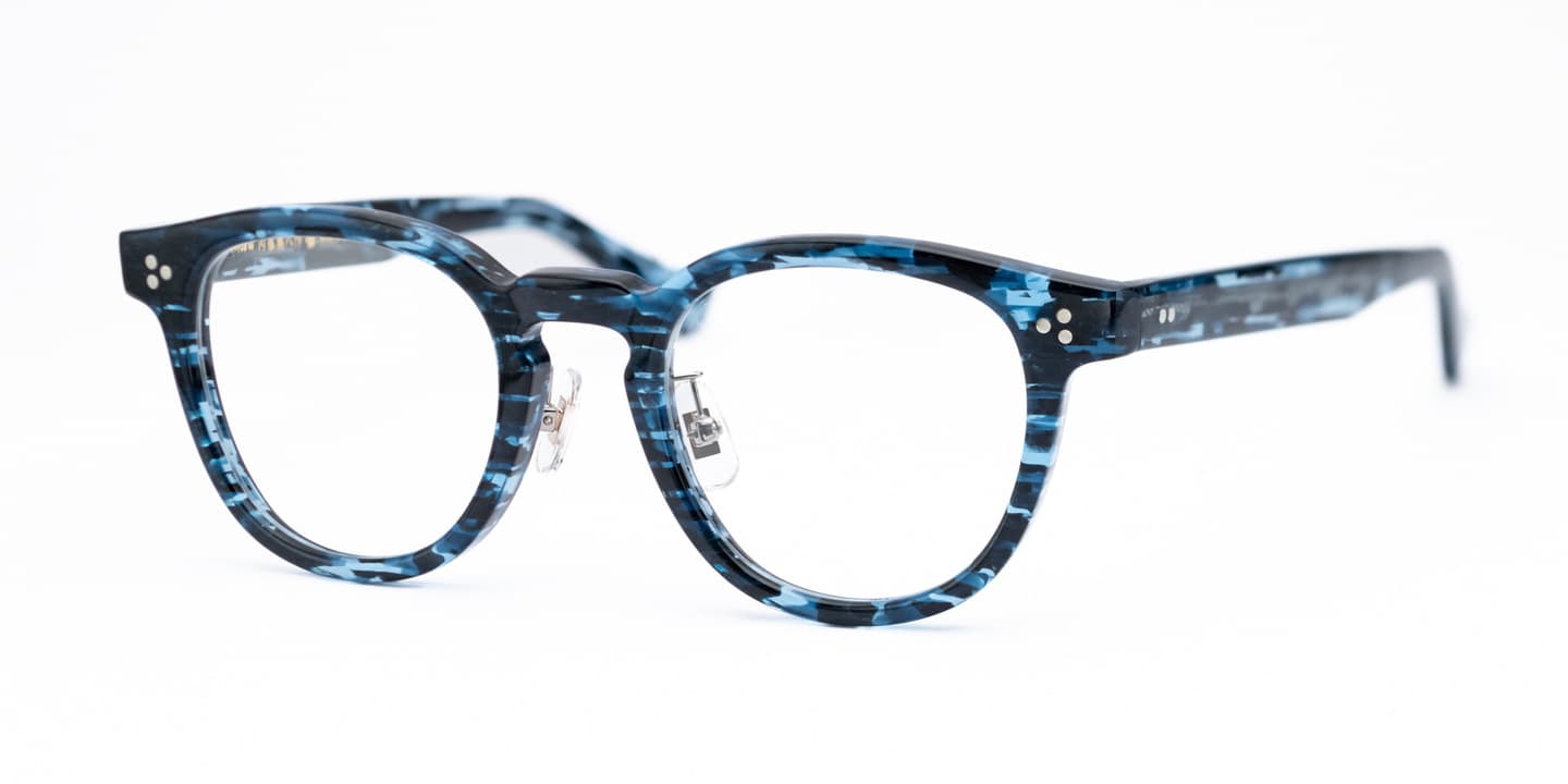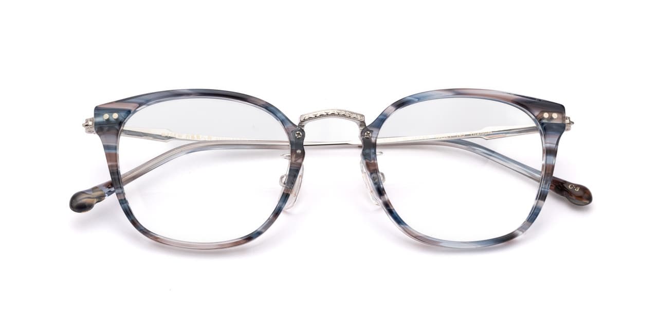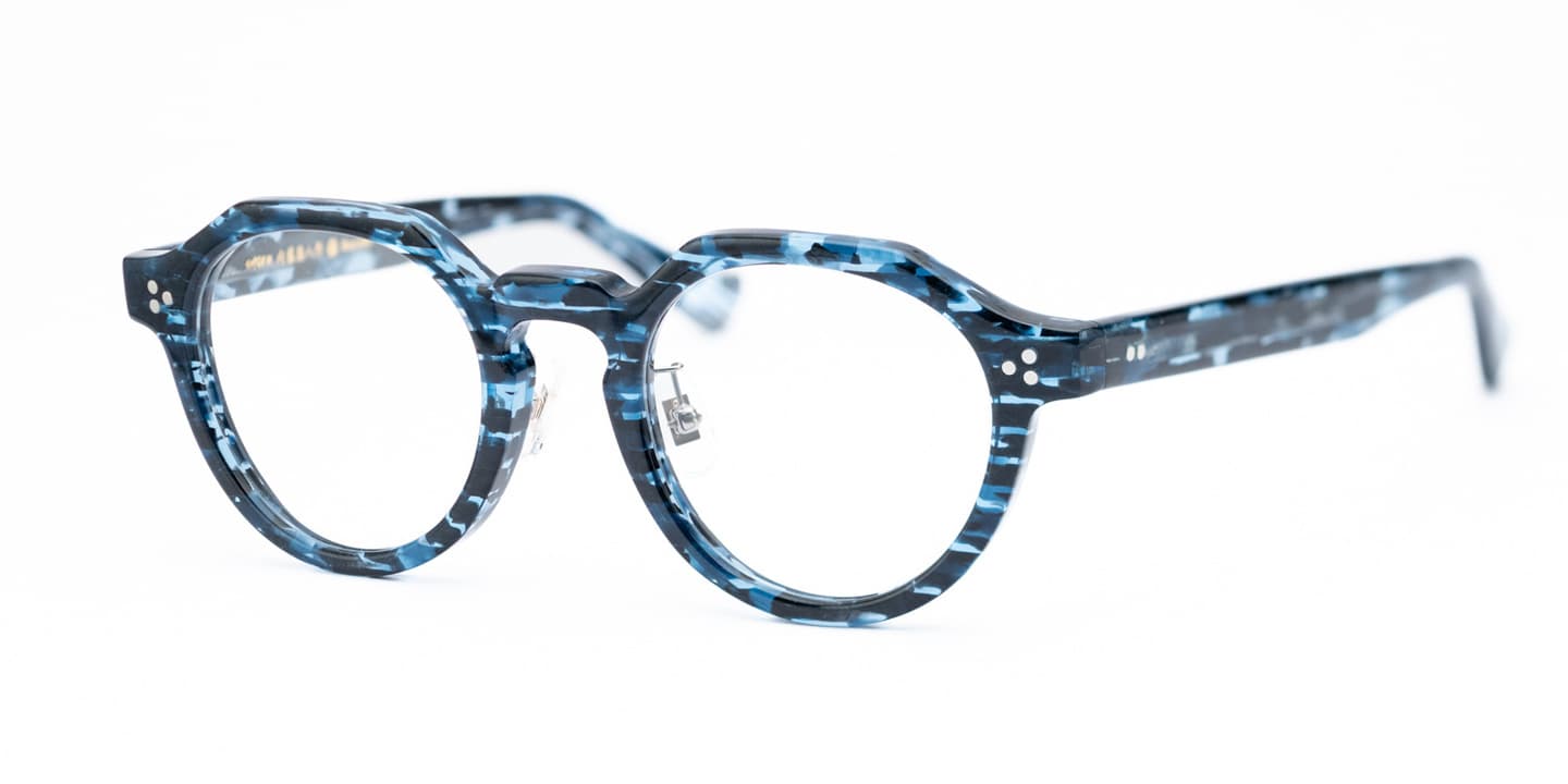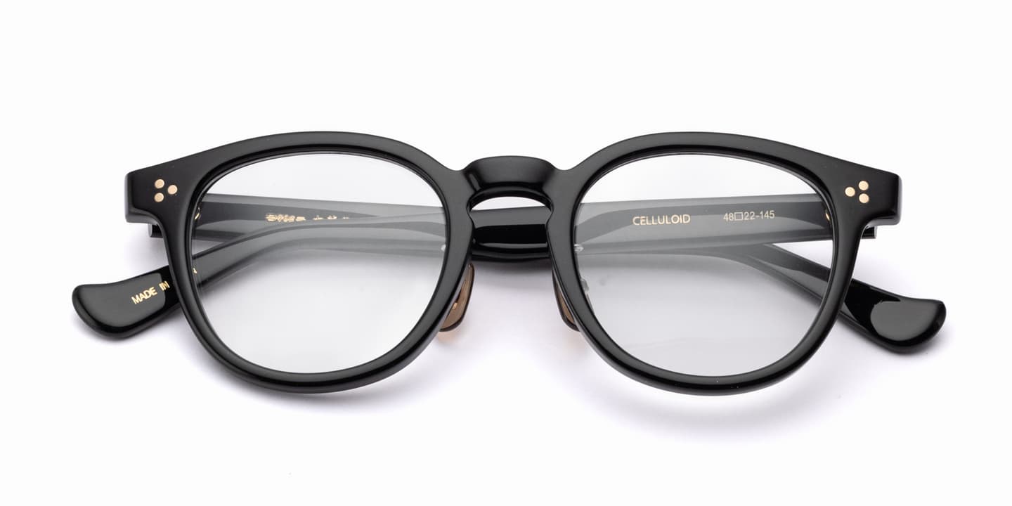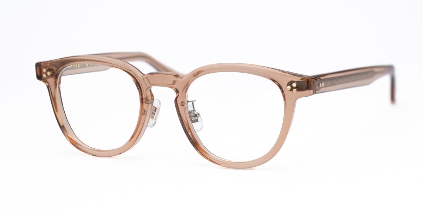 1950年代に大流行したレンズシェイプ「クラウンパント」は、見た目以上に顔馴染みが良く、意外にも自然に掛けこなせるデザインです。しかし、「N-121」は一味違います。内藤熊八ならではのひねりを効かせたディテールと、4mm厚のセルロイド生地が生み出す力強いフレームラインが、抜群の存在感を放ちます。また、N-120と同様にフロントの3点カシメ鋲がアクセントとなり、クラシックな雰囲気をさらに引き立てます。テンプルの芯金は淡い生地ほどその繊細な模様が際立ち、どのカラーを選ぶか悩ましいところ。あなたなら、どの一本を選びますか?