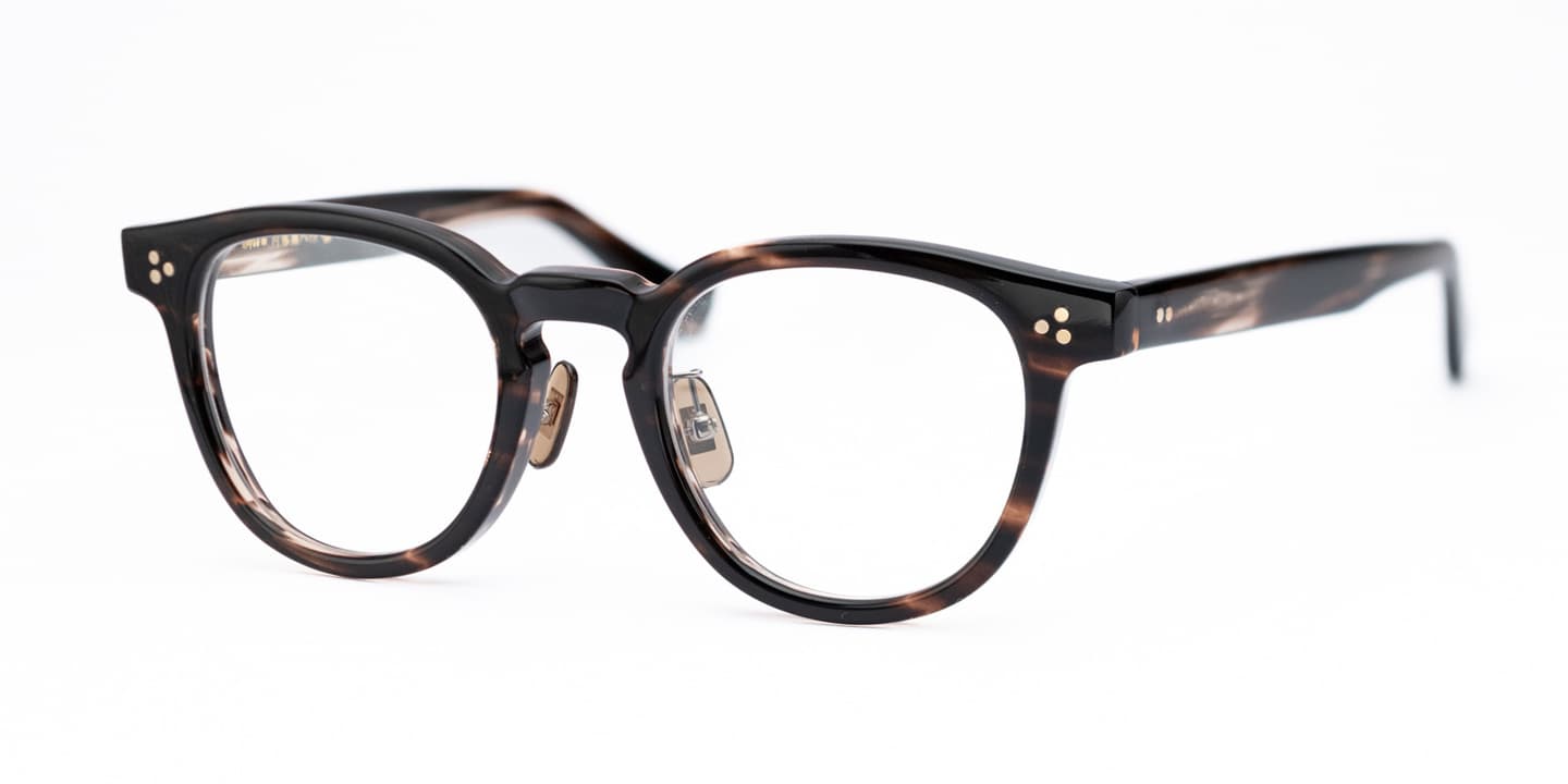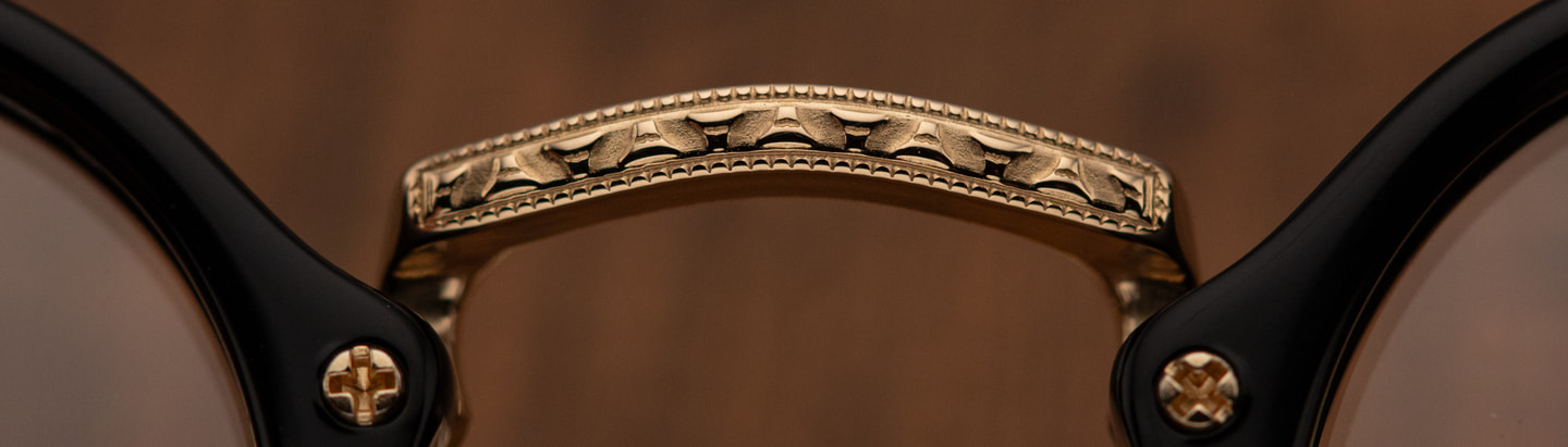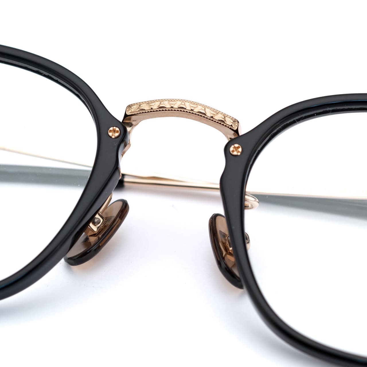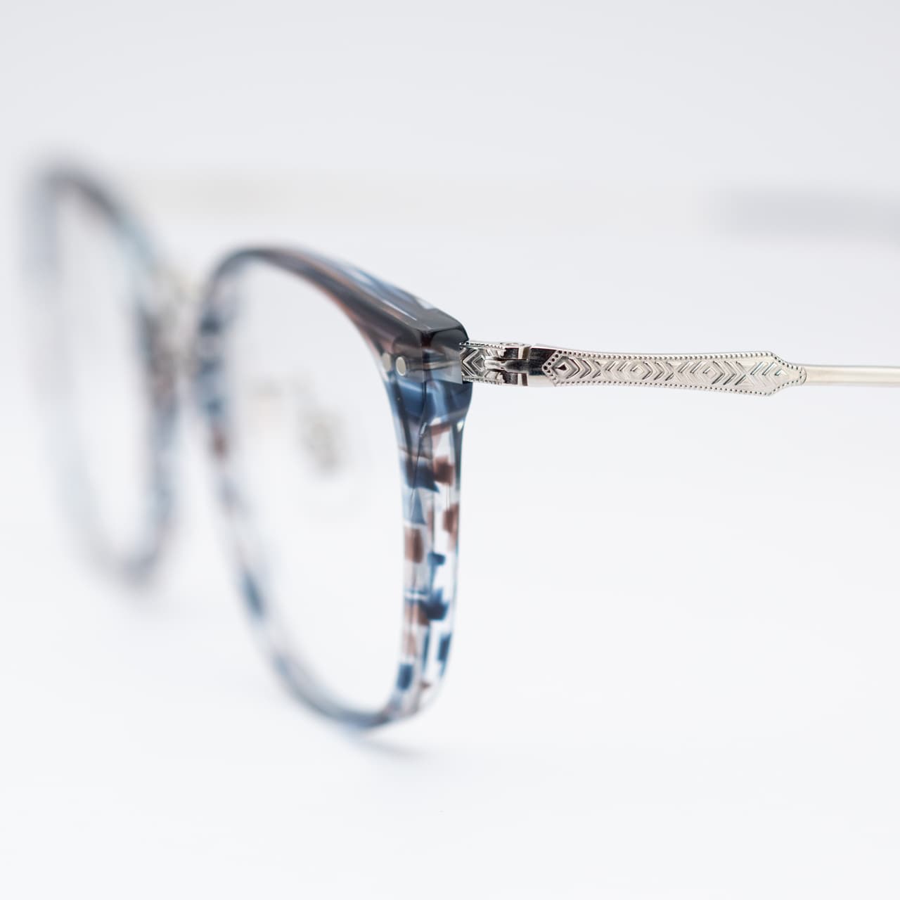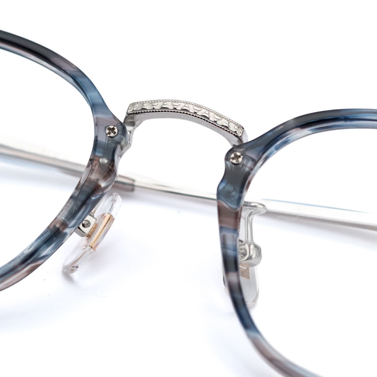 フロントの3点カシメ鋲がアクセントを添え、テンプルの芯金には杉綾織(ヘリンボーン)のような繊細な彫金模様を施しました。クラシックな雰囲気の中に、さりげないラグジュアリー感を演出しています。さらに、調整可能なクリングス仕様のノーズパッドにより、快適な掛け心地を実現しました。