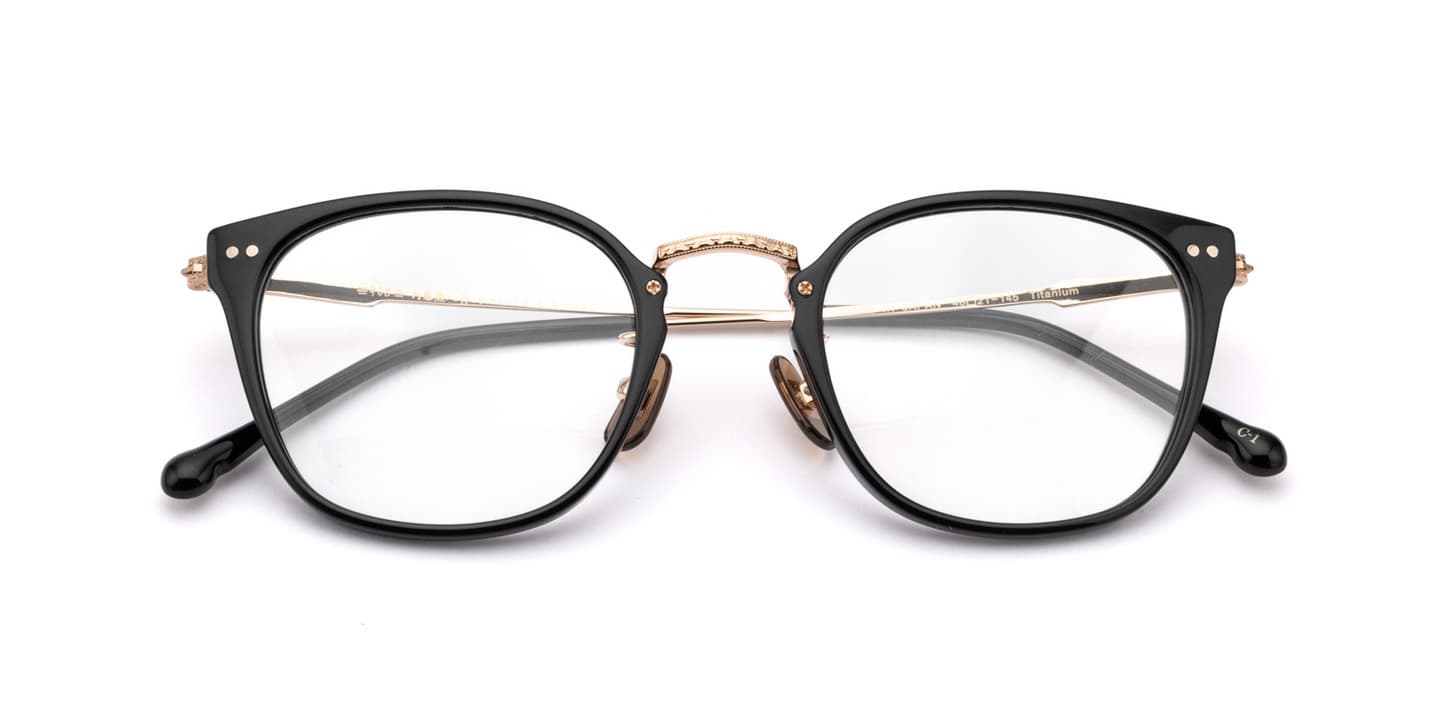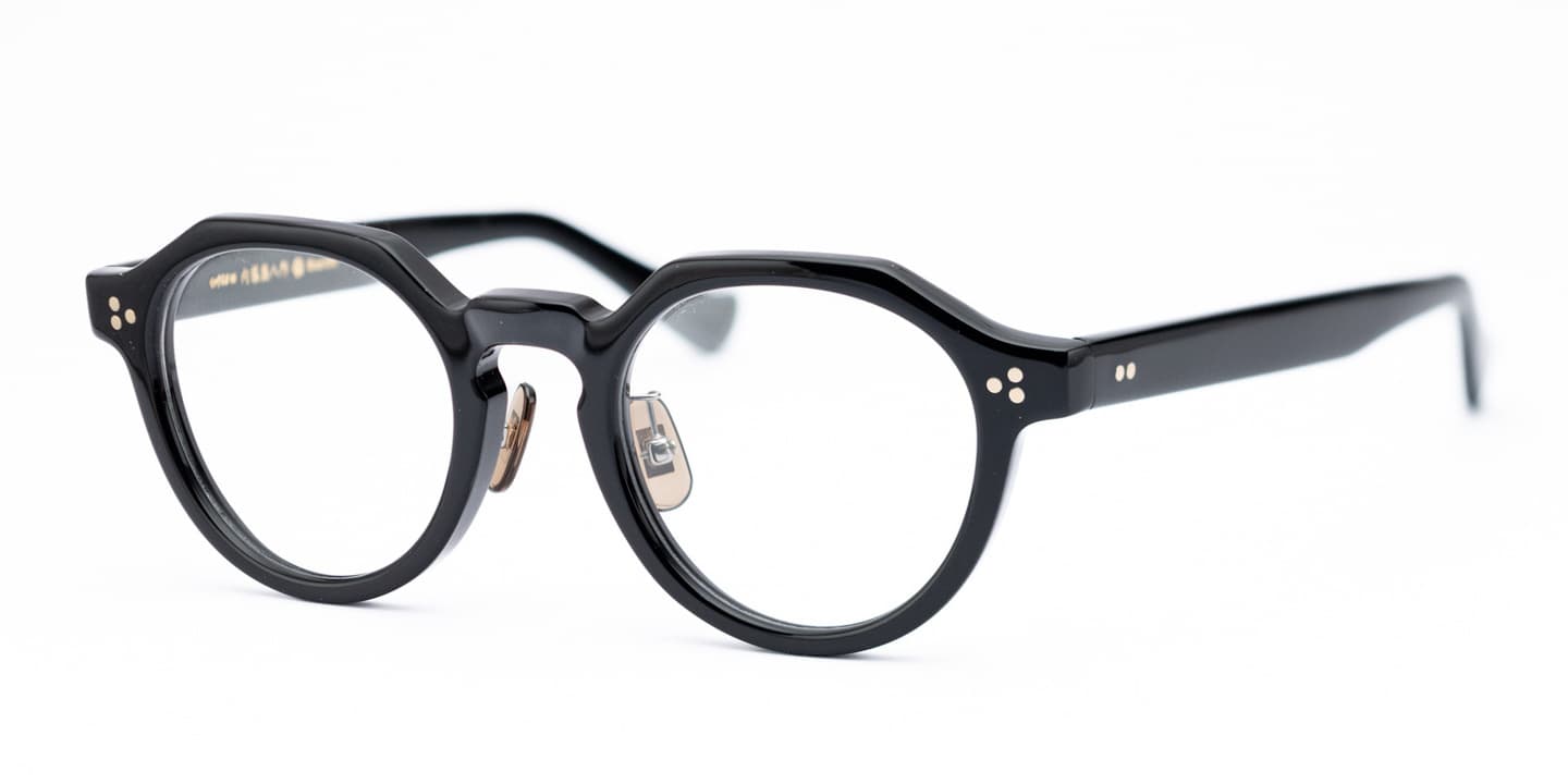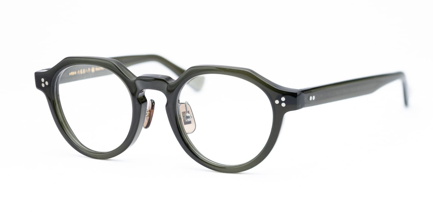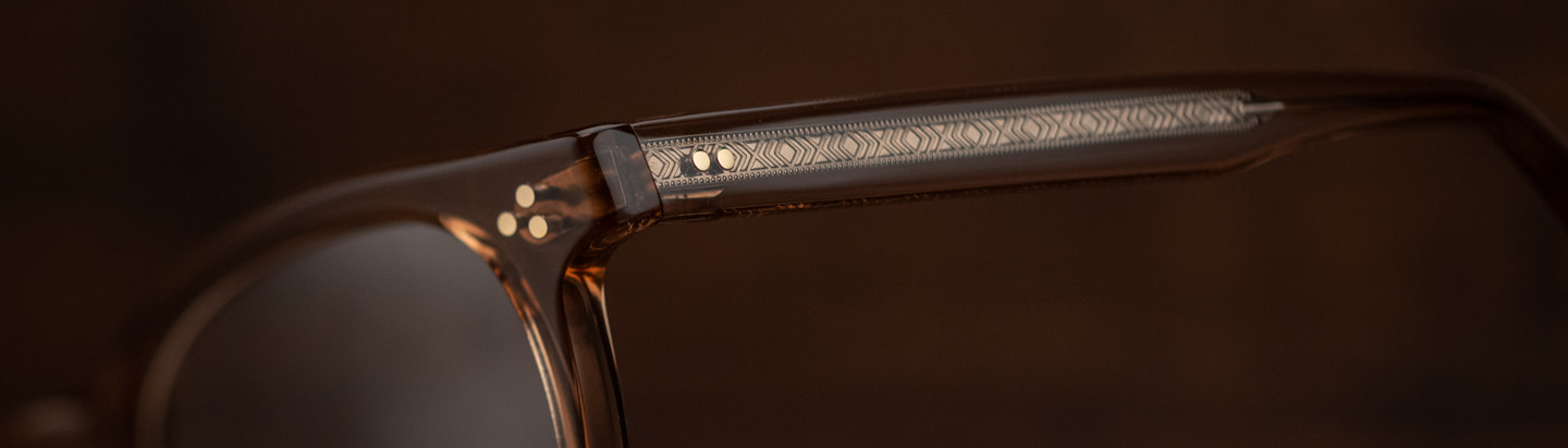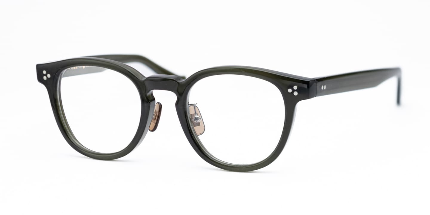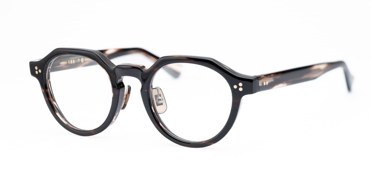 フロントの3点カシメ鋲がアクセントを添え、テンプルの芯金には杉綾織(ヘリンボーン)のような繊細な彫金模様を施しました。クラシックな雰囲気の中に、さりげないラグジュアリー感を演出しています。さらに、調整可能なクリングス仕様のノーズパッドにより、快適な掛け心地を実現しました。