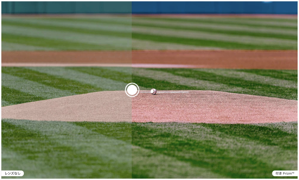 重要な色を鮮明にし、背景を強調して、ボールとその後ろの色とのコントラストを高めます。芝・土・を特に強調させるインフィールドタイプのレンズは、ボールの白さを最大限に引き立てるため、ゴロ等が見やすく、ピッチャーの球筋が読みやすくなります。