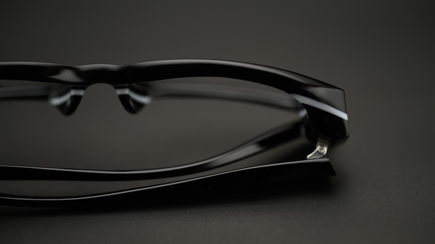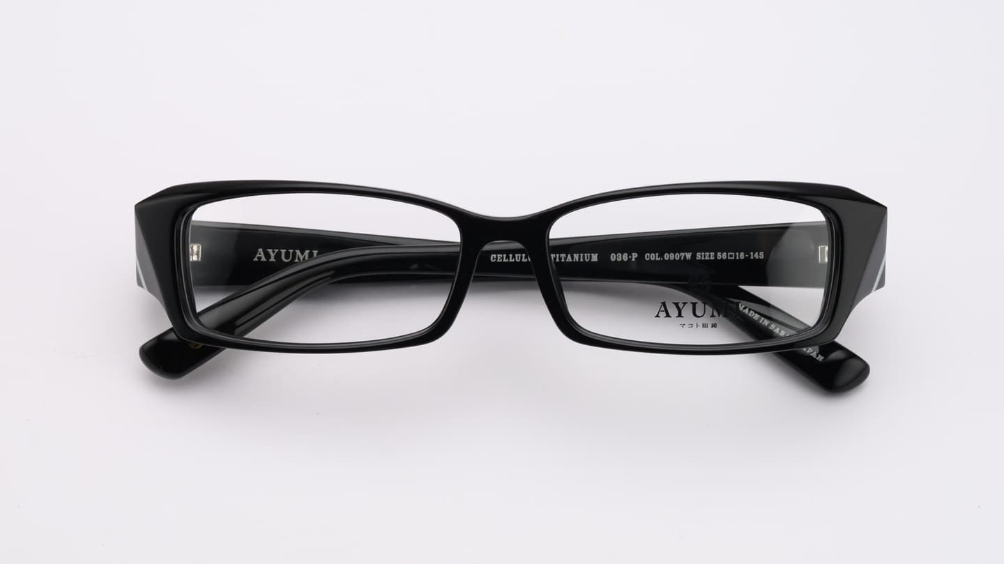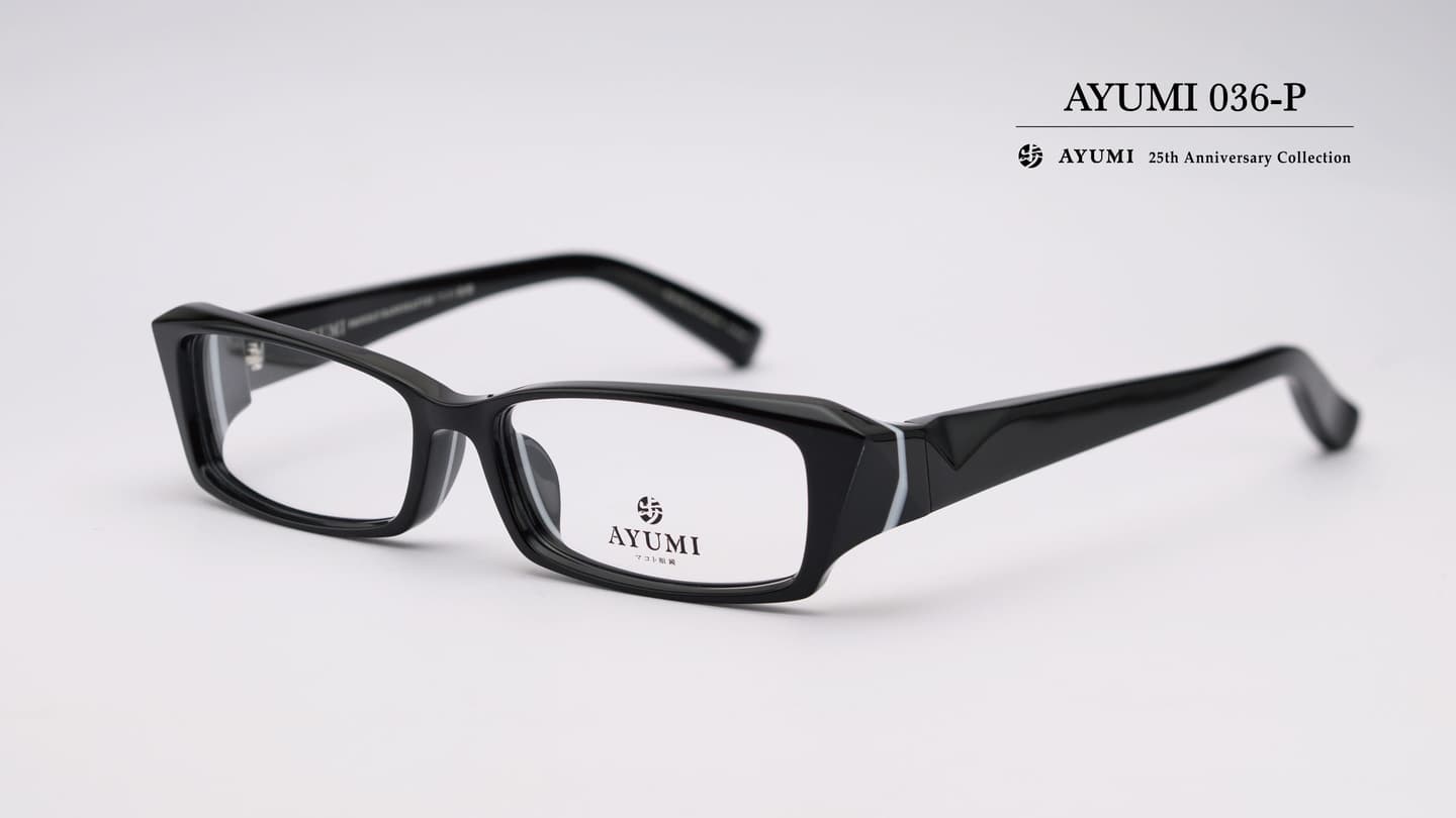 ものづくりの原点に立ち返りながら、新たな表現へと踏み出すことに挑戦した、いわば「コンセプトモデル」とも呼ぶべき特別な限定コレクションが、この25周年記念モデルです。ラインアップの中心となるのは、AYUMIの歴史の中で重要な存在である「AYUMI-036」をリニューアルした〈036-P〉。そこに、過去から受け継がれてきた思想の進化形と、未来を見据えたデザインを融合させた全5モデルで構成されています。カラーはすべて、表現力を最大限に引き出す「アユミブラック」のみ。圧倒的な存在感を放ちながらも、掛けた瞬間に感じられるのは、驚くほどやさしく包み込まれるような掛け心地。その両立こそが、本モデルの目指した理想ではないでしょうか。艶とマット(艶消し)を巧みに使い分けることで生まれる光と影。見る角度によって表情を変えるその佇まいは、静かでありながら確かな品格を宿しています。