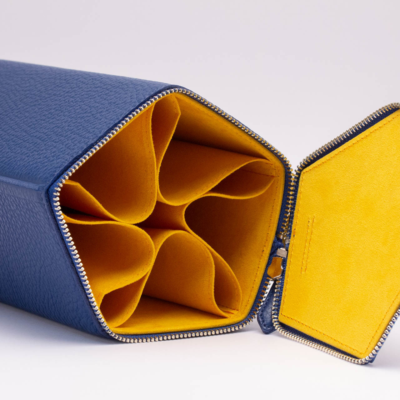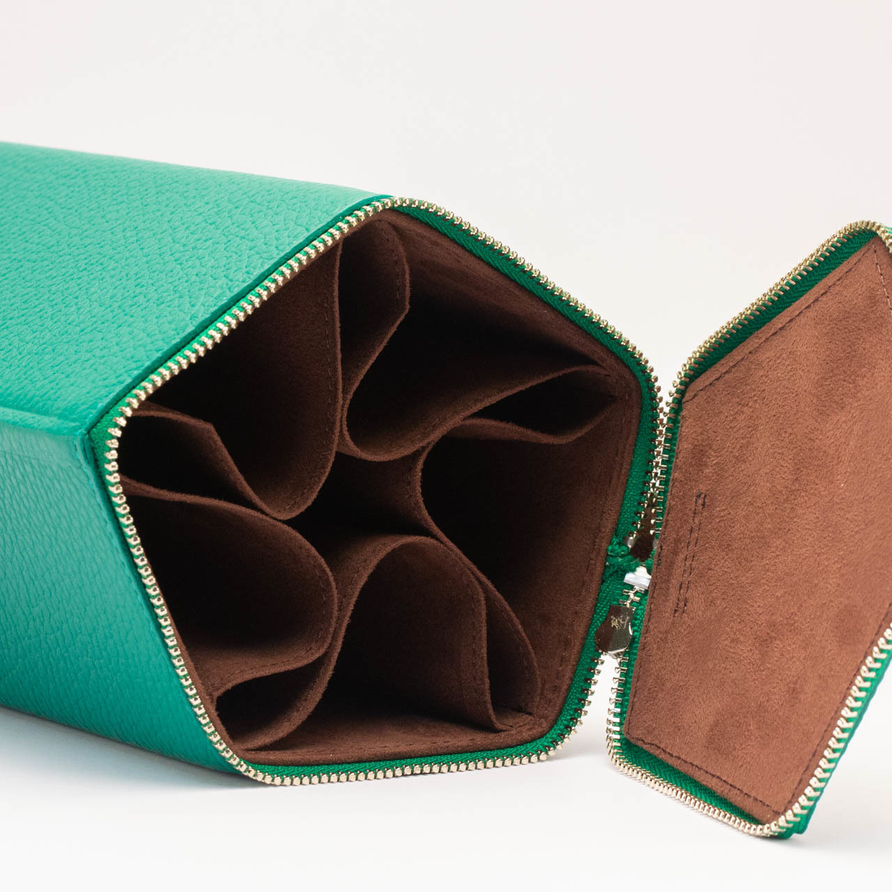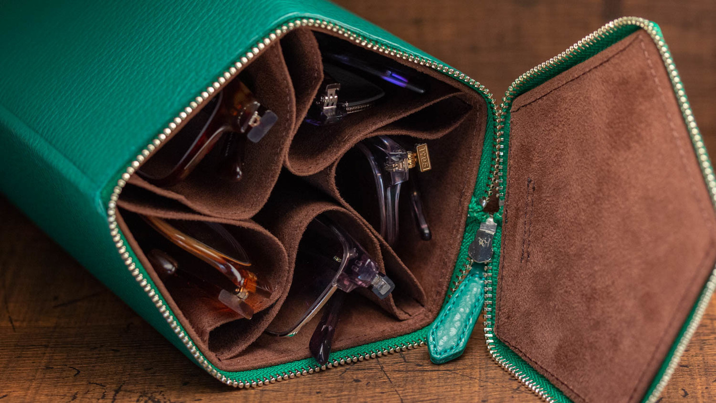 ファスナーを開けていただくと、中から5つのポケットが現れます。このポケットは仕切りが固定されていないため、大きなフレームや小さなフレームを混合でしまっても、それぞれに合うよう自動的に調整されます。ポケットには化繊のスエードを使用しています。肌触りがなめらかであり、メガネやサングラスにとって居心地の良い空間になっています。