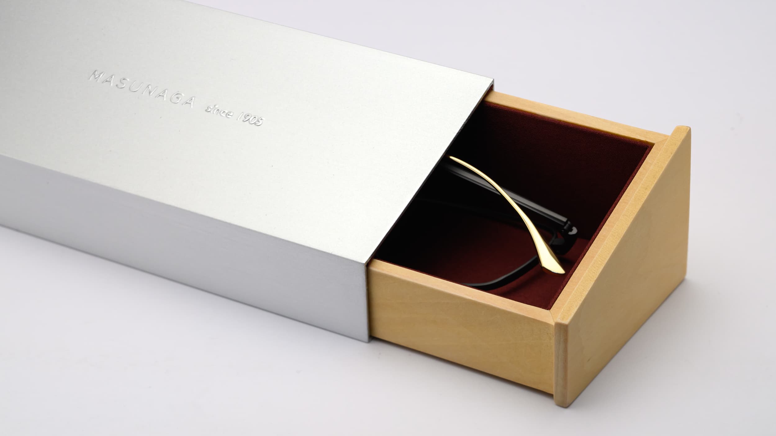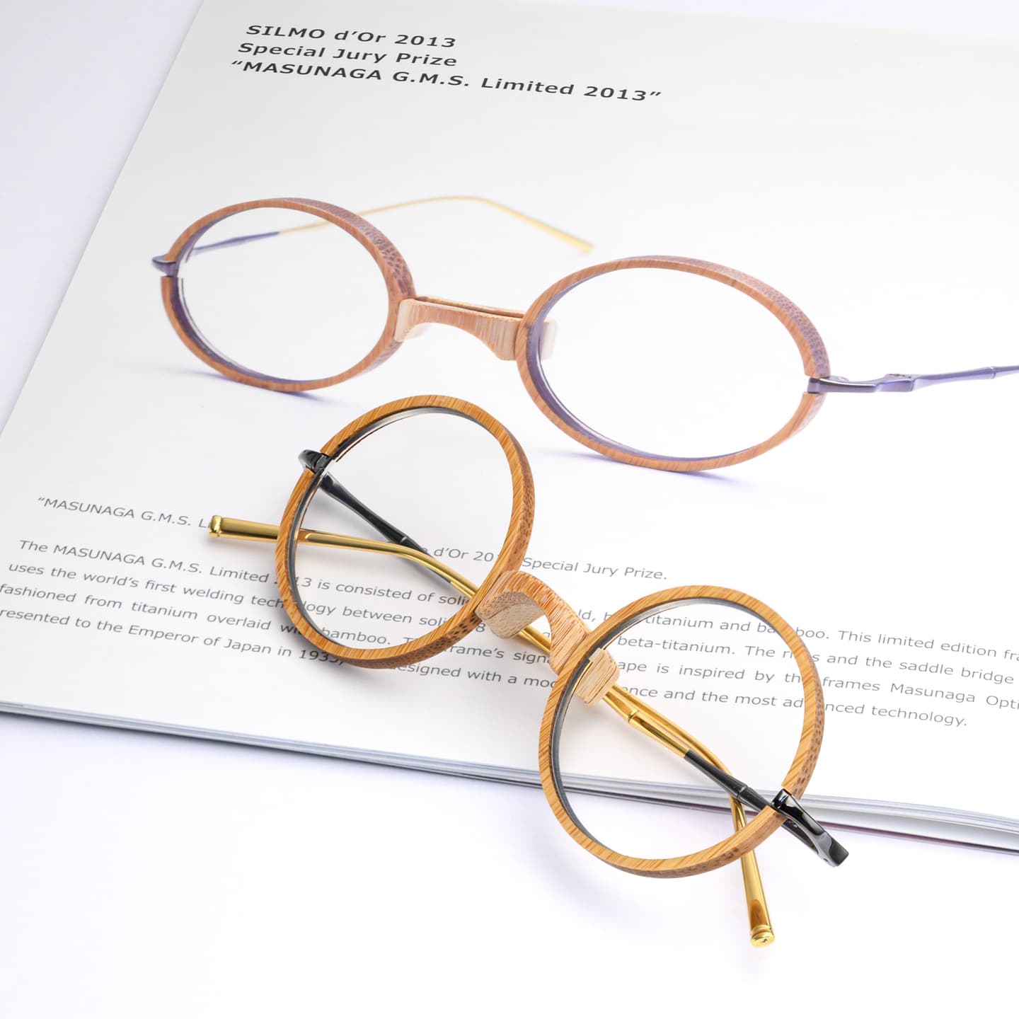 「MASUNAGA G.M.S. Limited 2013」は、2013年の世界最大の眼鏡のエキシビション「SILMO Paris 2013」にてシルモ・ドール(SILMO d'Or)特別審査員賞を受賞しました。MASUNAGA G.M.S. Limited 2013は、18金、ベータチタン、そして竹から成る限定モデルです。このフレームには、18金とベータチタンを接合する世界初の溶接技術が用いられています。リムと山(ブリッジ)は、竹を重ねたチタンで仕上げられています。このフレームの特徴的な形状は、1933年に増永眼鏡が天皇陛下に献上した眼鏡にインスピレーションを得ており、現代的なエッセンスと最先端の技術でデザインされています。G.M.S. とは GOZAEMON MASUNAGA SPECTACLES の略。創業者の増永五左衛門の名を冠した増永眼鏡を代表するブランドです。