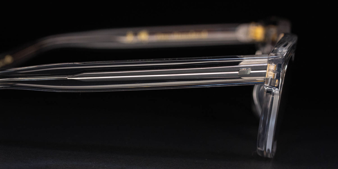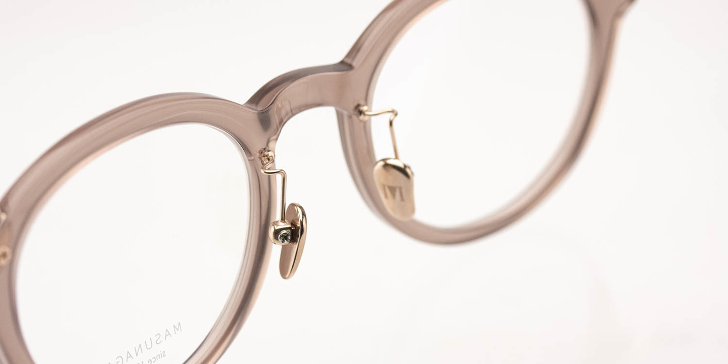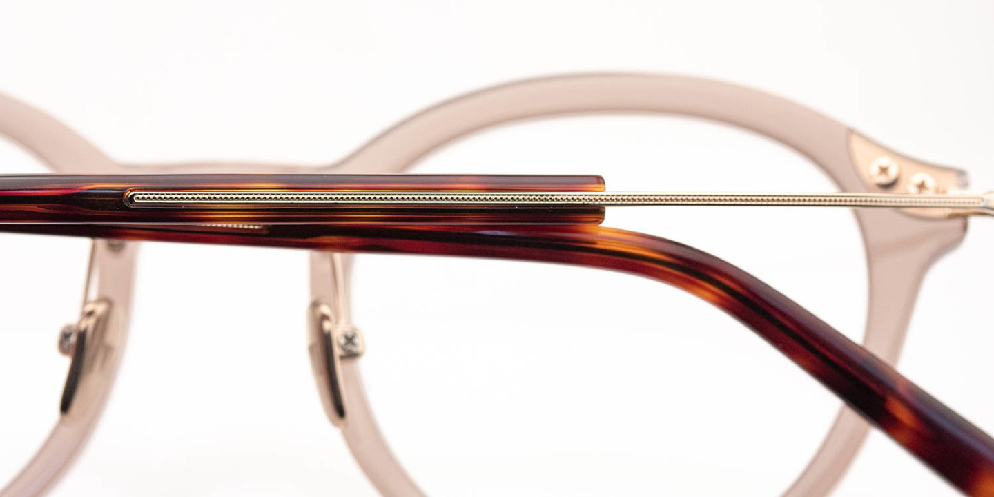 弾力のあるβチタン製の細いメタル表面に施されたミル打ち風加工は熟練のプレス処理による高度な技術で仕上げられ、艶やかな長めのモダン(耳に掛かるプラスチックの部分)を組み合わせ美しく、そして掛け心地を際立てています。