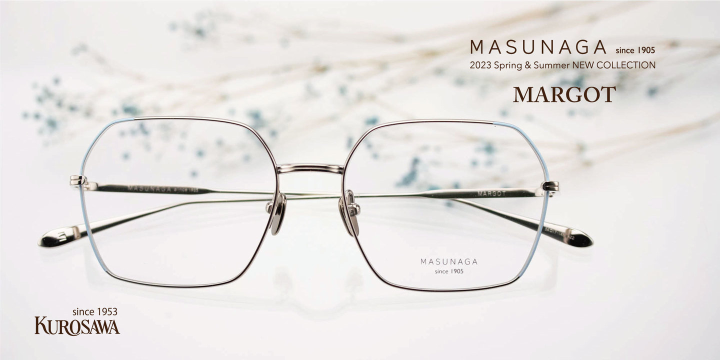 1970年から1980年に流行したビックフレームと、洗練さを掛け合わせることで生まれた MARGOT は、女性の内なる強さを引き出してくれます。シンプルなラインと MASUNAGA ならではのカラーリングは、新しいビックシェイプの在り方を提案しております。シルバーを基調とした color #22 は、ポイントとなる魅力的なブルーがエレガンスを演出しております。