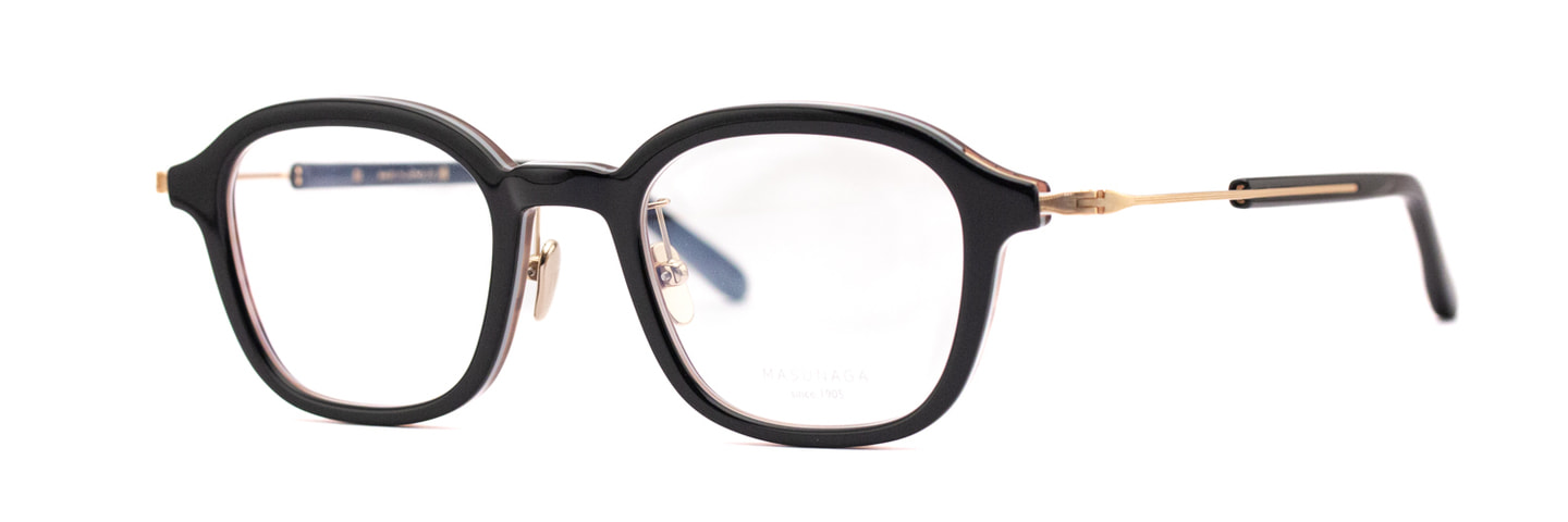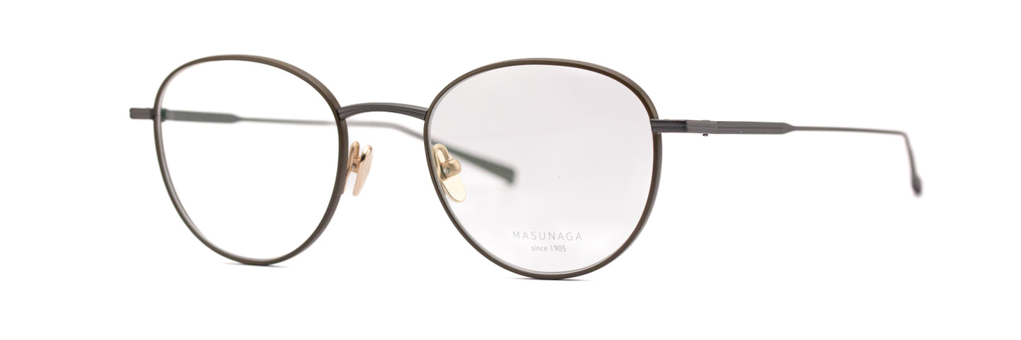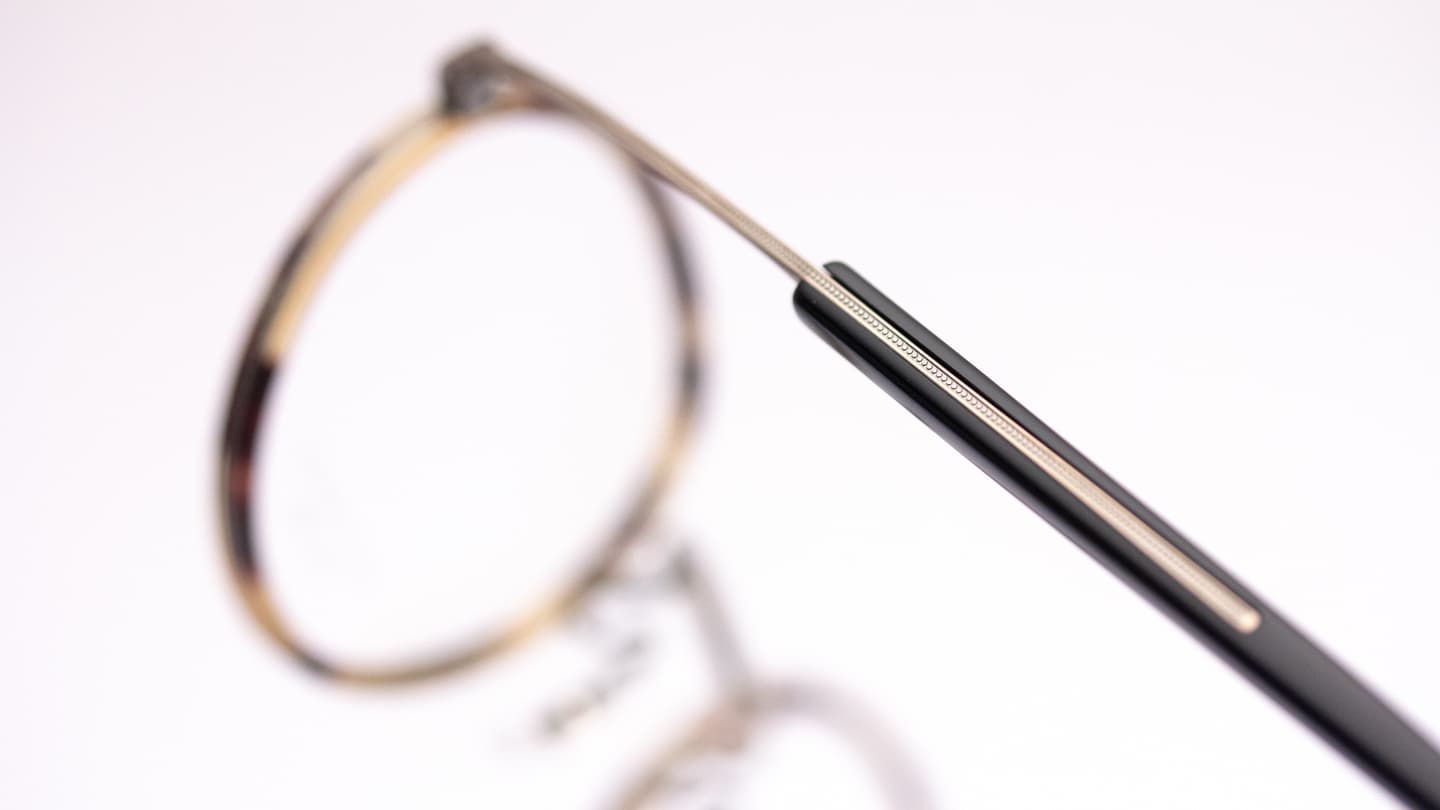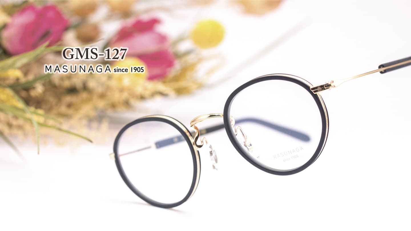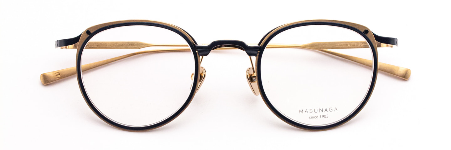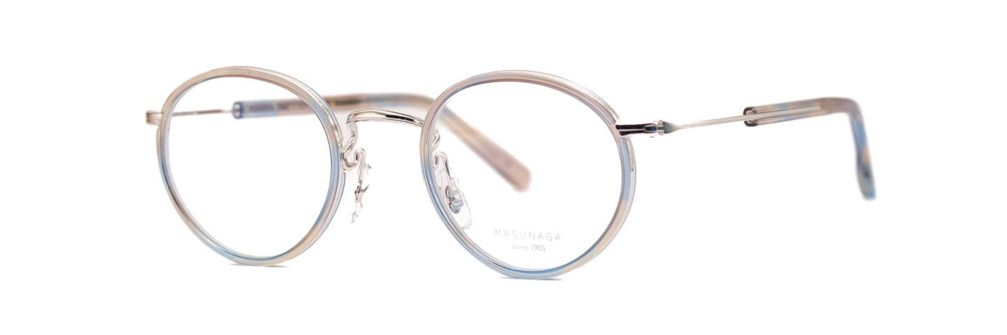 ソフトリムとメタルの組み合わせが美しいGMS-127。小ぶりなパントシェイプでモダンクラシックなフレームに仕上がりました。メタルリムには「Gozaemon Masunaga Spectacles」と刻まれた遊び心のあるデザインが特徴です。全3色展開で、#39 BKはゴールドとブラックのコントラストが美しいコンビネーション。一方、#25 BL-BRは淡く爽やかなブルーと琥珀のようなブラウンのミックスで、全体的に艶やかでエレガントな仕上がりになりました。