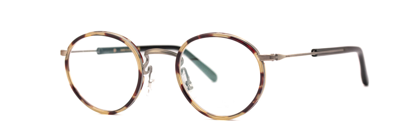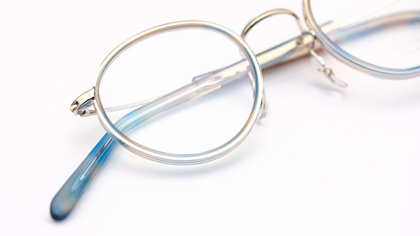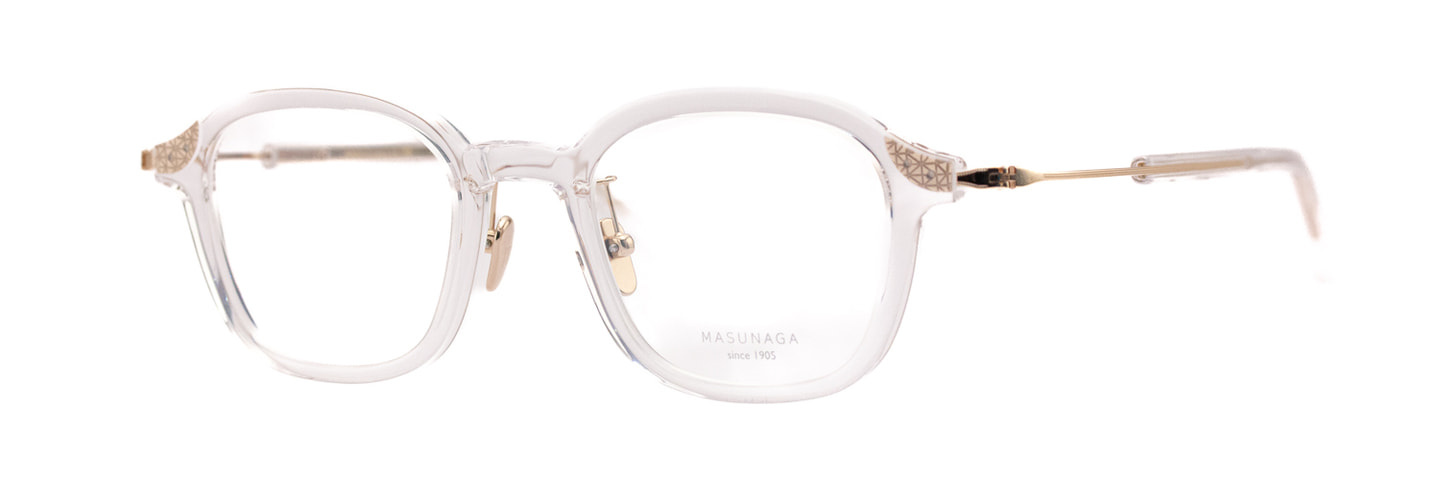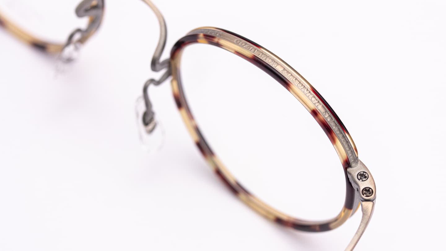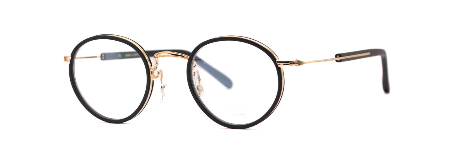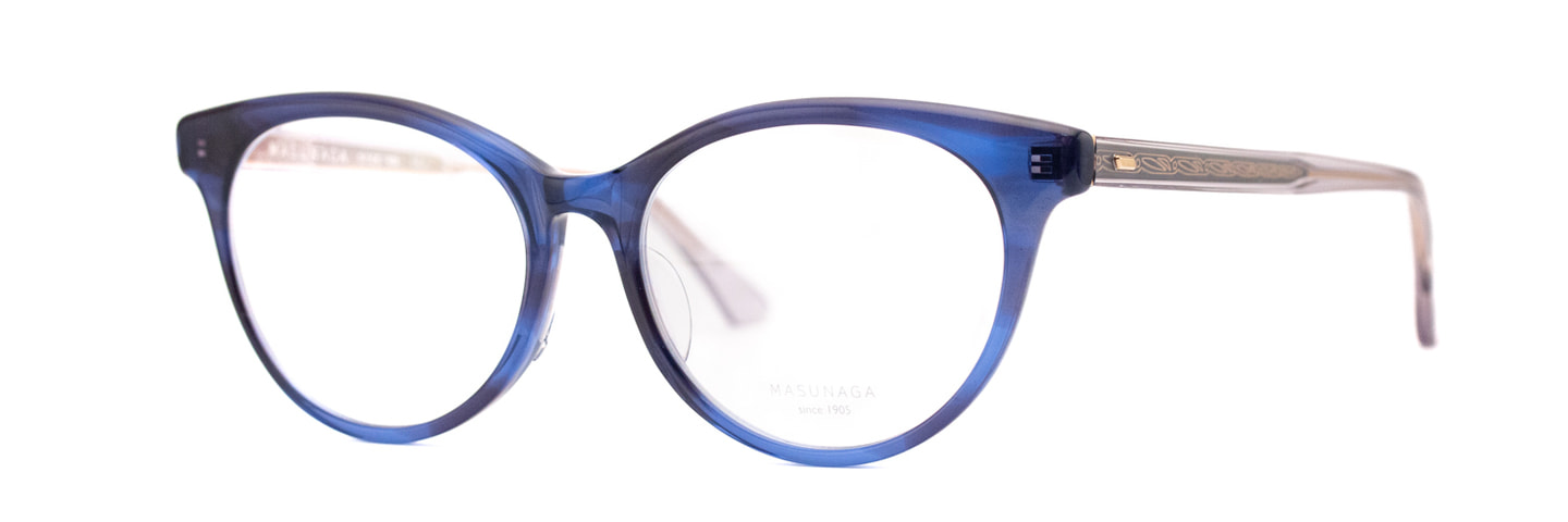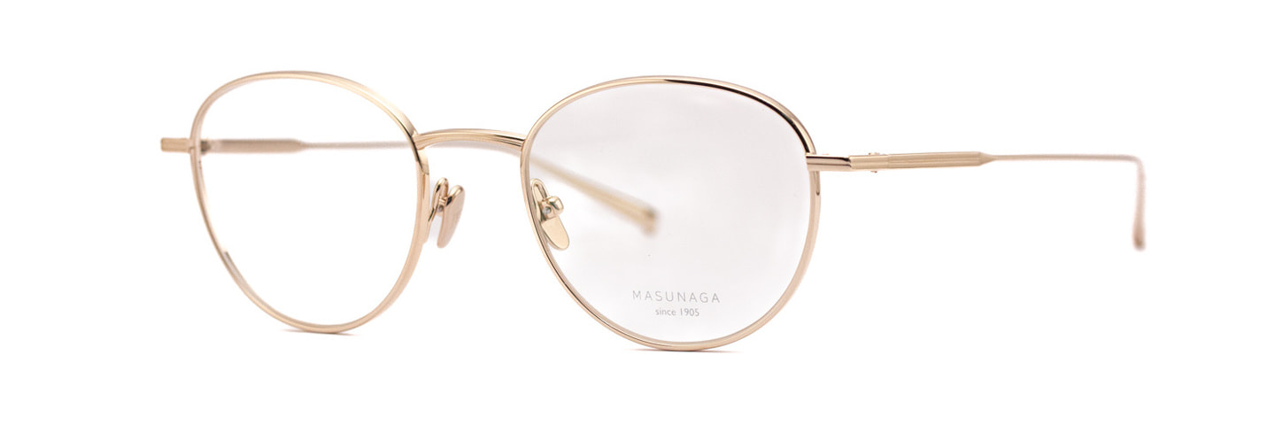 ソフトリムとメタルの組み合わせが美しいGMS-127。小ぶりなパントシェイプでモダンクラシックなフレームに仕上がりました。メタルリムには「Gozaemon Masunaga Spectacles」と刻まれた遊び心のあるデザインが特徴です。全3色展開で、#39 BKはゴールドとブラックのコントラストが美しいコンビネーション。一方、#25 BL-BRは淡く爽やかなブルーと琥珀のようなブラウンのミックスで、全体的に艶やかでエレガントな仕上がりになりました。