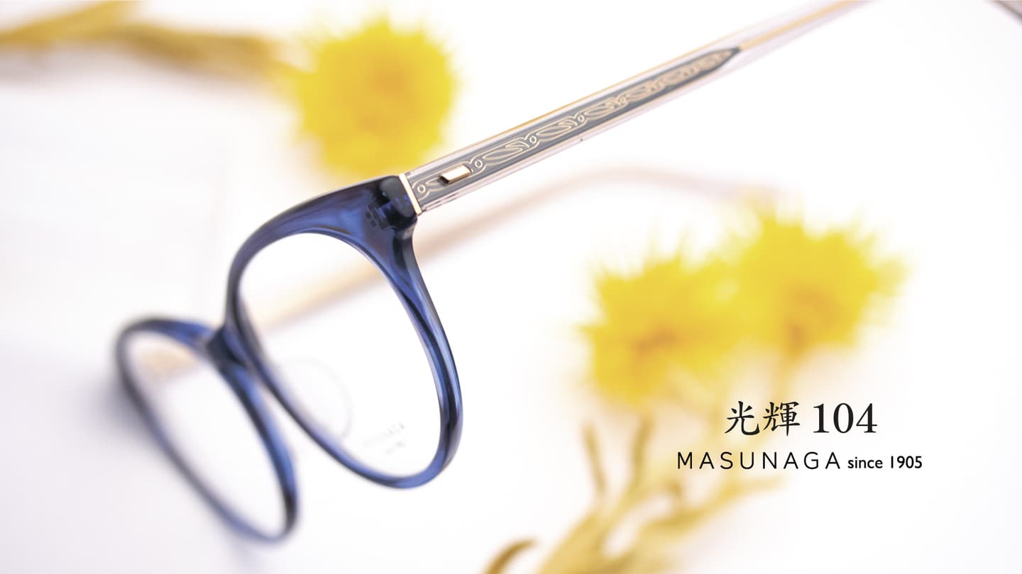 光輝104は天地が深く柔らかいフォックスシェイプ。ボタニカル模様をあしらったテンプルコア、合口の飾り、そして立体的なリベットがフレームのグレードを引き上げます。こちらのcolor : #25 Navyは、テンプルのボタニカル模様に施されたブルーから見えるゴールドと、フロントブルーとのハーモニーでリッチな印象を生み出します。