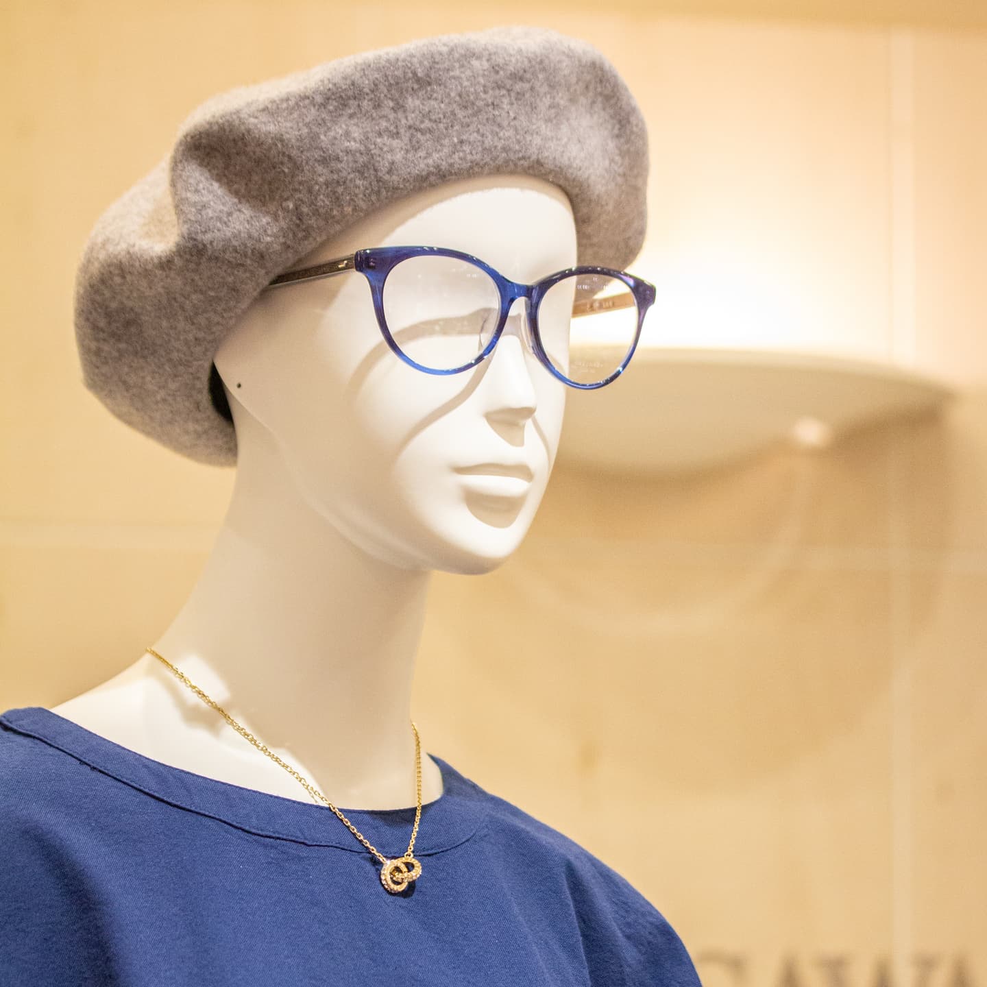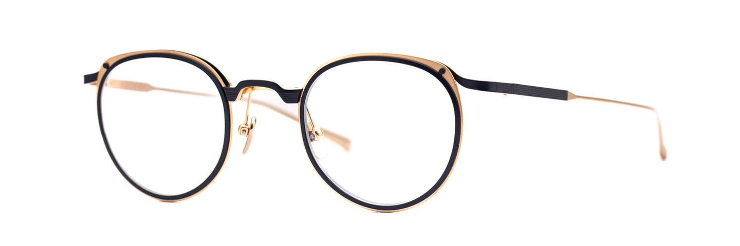 フレーム前面のリムバー、極薄リム、そしてインナーリムのトリプル構造が特徴のALTUS。デザインのアクセントでもあるドットポイントがメタルをつなぎます。#25 NAVYはネイビーとゴールドの組み合わせで、掛けると動きを見せ、メインのネイビーからゴールドがちらりと輝く、とてもリッチな仕上がりになっています。