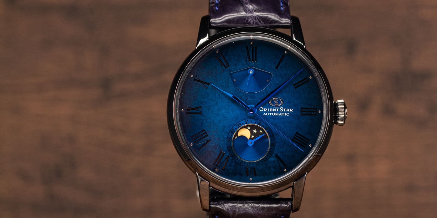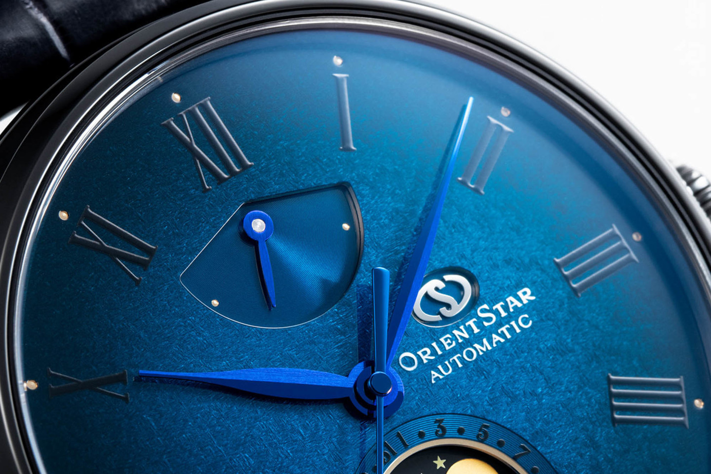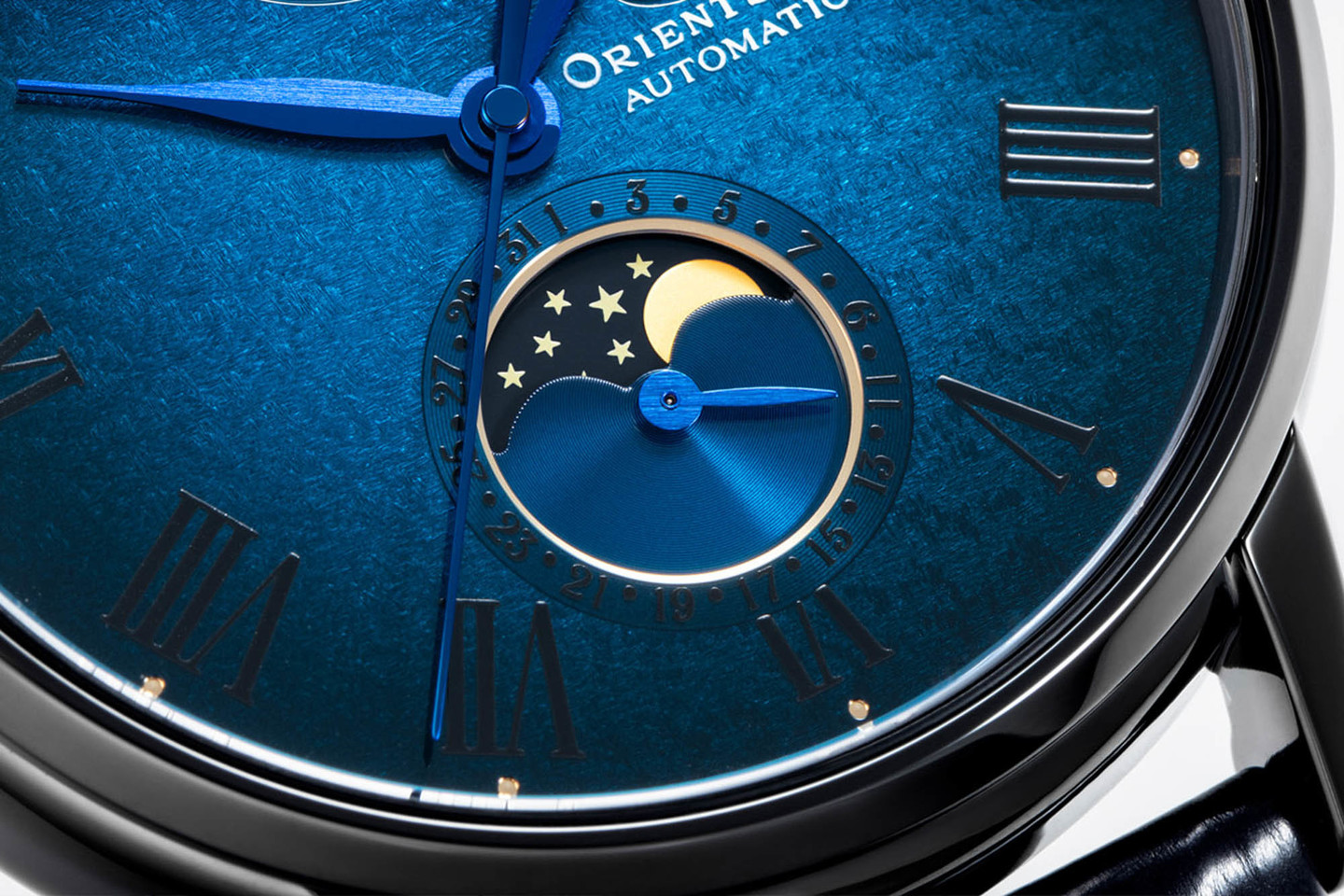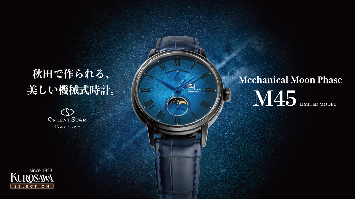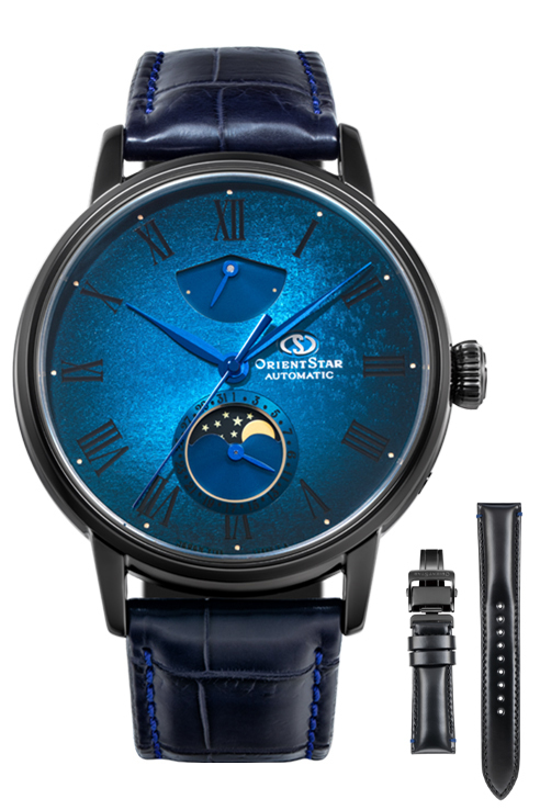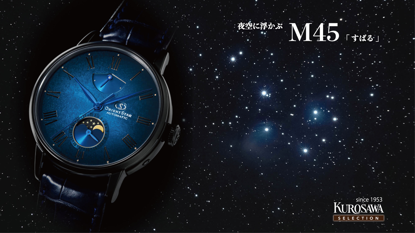 クラシックコレクションに新たに加わった『メカニカルムーンフェイズM45』のテーマは、夜空を神秘的に彩る星団の「M45(すばる)」。「すばる」とは、冬の夜空に見られるおうし座の散開星団です。本モデルでは夜空に浮かぶ無数の星々を表現するために、文字盤表面に高度な型打ち模様を施しました。この繊細な型打ち模様は、光の入る角度によって表情が変化し、星がきらめく情景を文字盤に作り出します。さらに特殊な塗料をグラデーションさせながら塗布し中心部のブルーから外周に向かいブラックへと微妙に変化する階調を生み神秘的な夜空の奥深さを演出しました。オリエントスターの高度な文字板製造技術により時計愛好家を宇宙への深淵へと誘う『メカニカルムーンフェイズM45』は、プレステージショップ限定の特別モデルとなります。バンドには深宇宙を思わせるネイビー色の本ワニ皮革と黒色のコードバンが付属します。