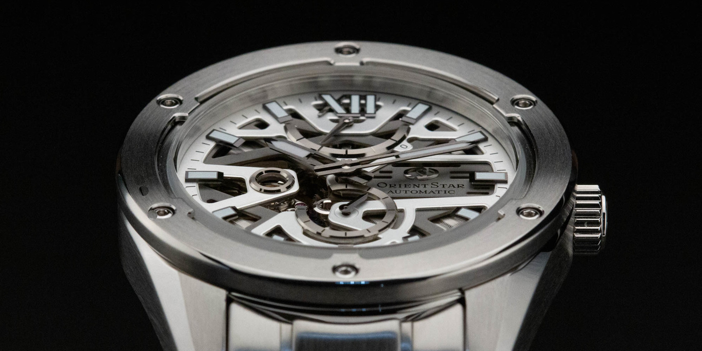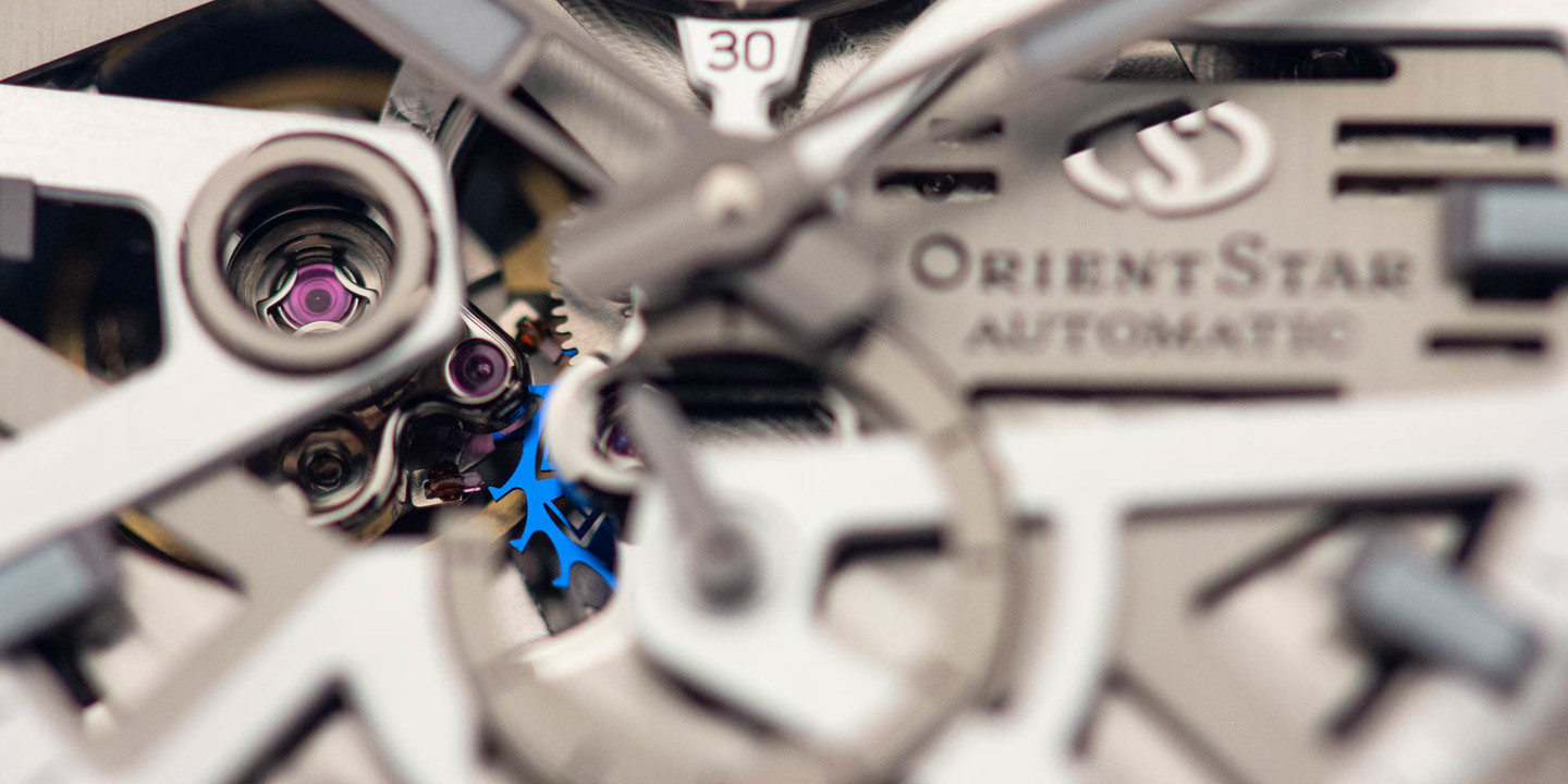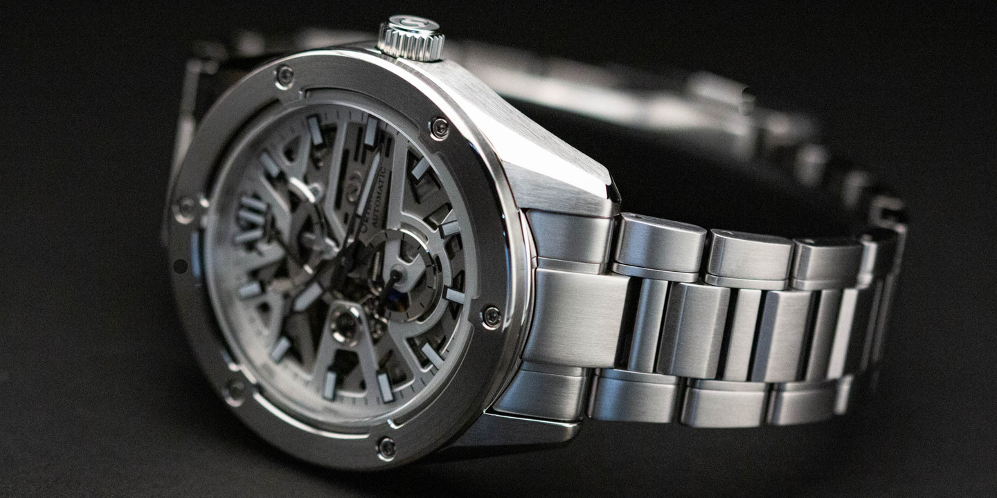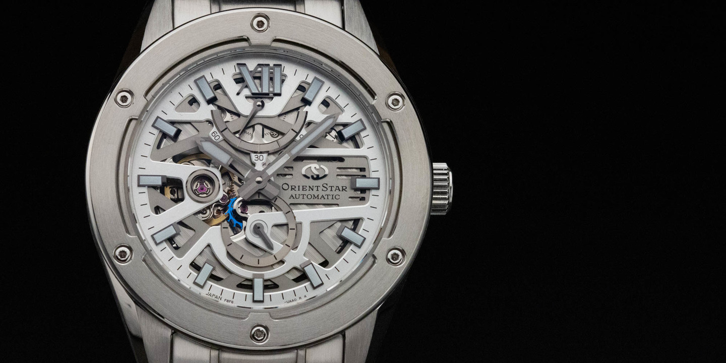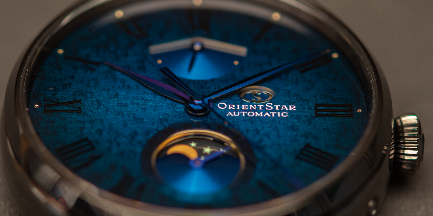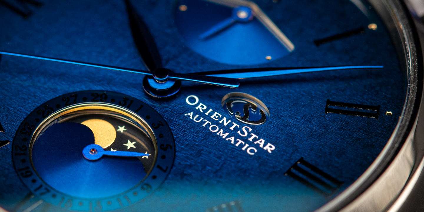 クラシックコレクションに新たに加わった『メカニカルムーンフェイズM45』のテーマは、夜空を神秘的に彩る星団の「M45(すばる)」。「すばる」とは、冬の夜空に見られるおうし座の散開星団です。本モデルでは夜空に浮かぶ無数の星々を表現するために、文字盤表面に高度な型打ち模様を施しました。この繊細な型打ち模様は、光の入る角度によって表情が変化し、星がきらめく情景を文字盤に作り出します。さらに特殊な塗料をグラデーションさせながら塗布し中心部のブルーから外周に向かいブラックへと微妙に変化する階調を生み神秘的な夜空の奥深さを演出しました。オリエントスターの高度な文字板製造技術により時計愛好家を宇宙への深淵へと誘う『メカニカルムーンフェイズM45』は、プレステージショップ限定の特別モデルとなります。バンドには深宇宙を思わせるネイビー色の本ワニ皮革と黒色のコードバンが付属します。