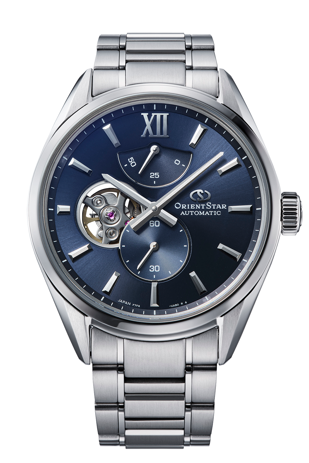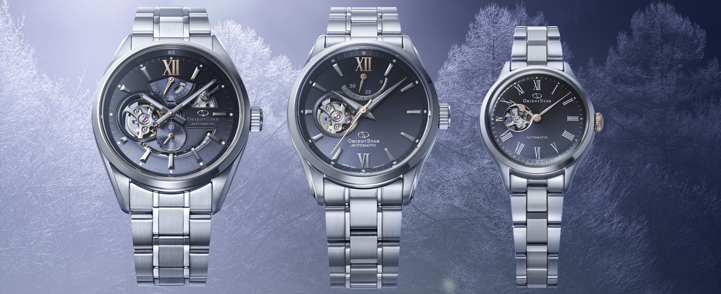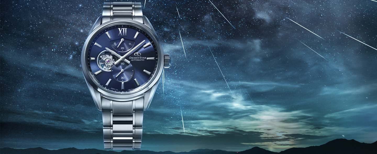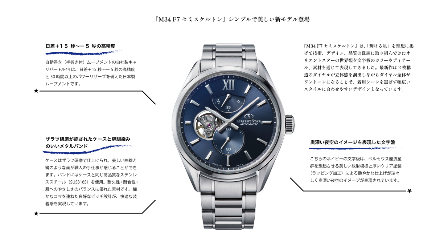 オリエントスターの魅力を体感できるエントリーモデル的な商品「M34 F7 セミスケルトン」が、シンプルで美しくマイナーチェンジが行われ最新作として登場いたしました。華美からの脱却をコンセプトにシンプル化を図った最新作のうち、ネイビー文字板はペルセウス座流星群をイメージさせる美しい放射模様を施した文字板によって奥深い夜空が表現されています。