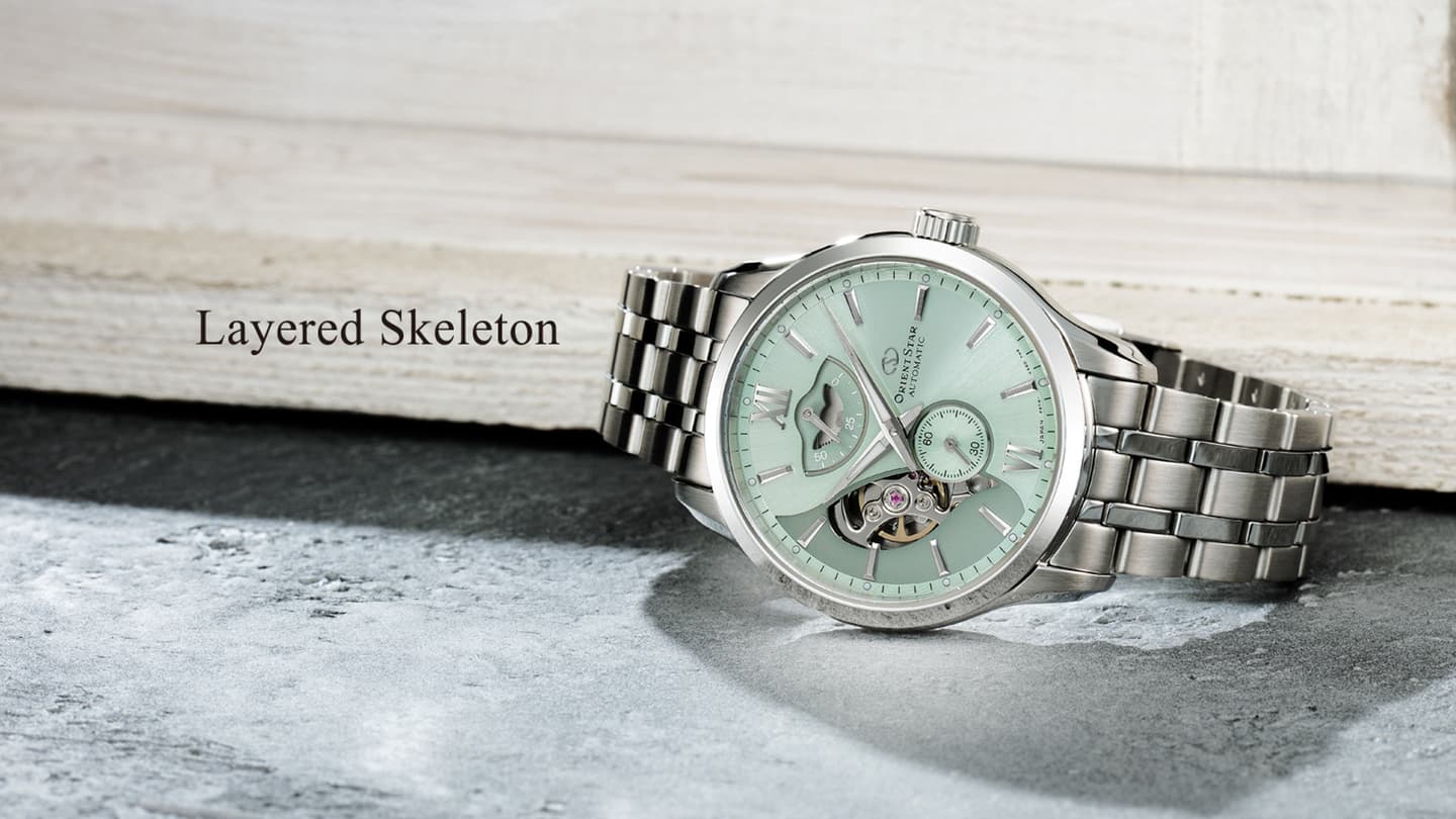「Orient Star」のコンテンポラリーコレクションからユニークなデザインが注目を浴びる『レイヤードスケルトン』に、海のリゾートを感じさせるダイヤル色を用いたシャンパンゴールドのレギュラー1 モデルとミントグリーンの国内数量限定 1 モデル (400 本) が2025年3月13日に発売になります。
