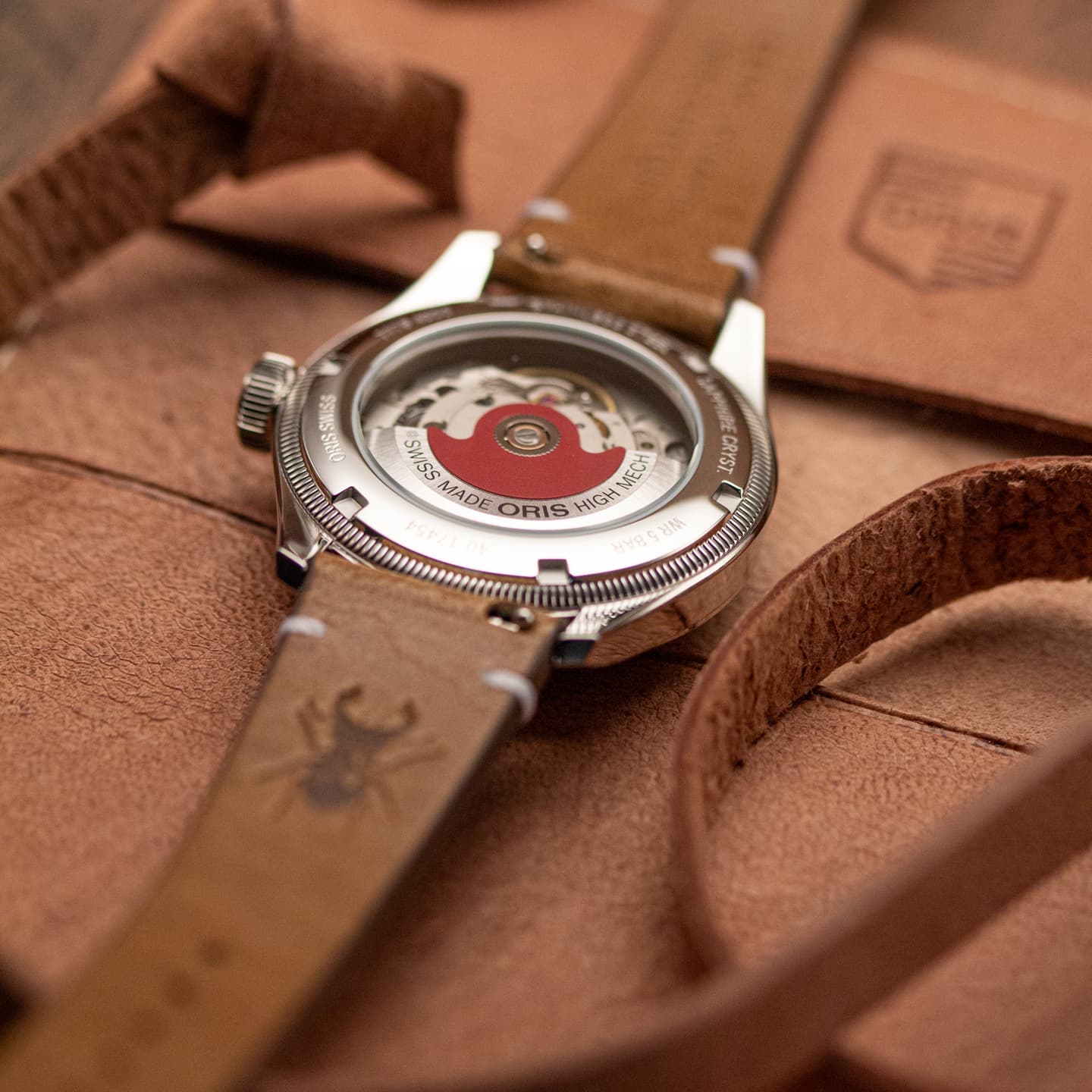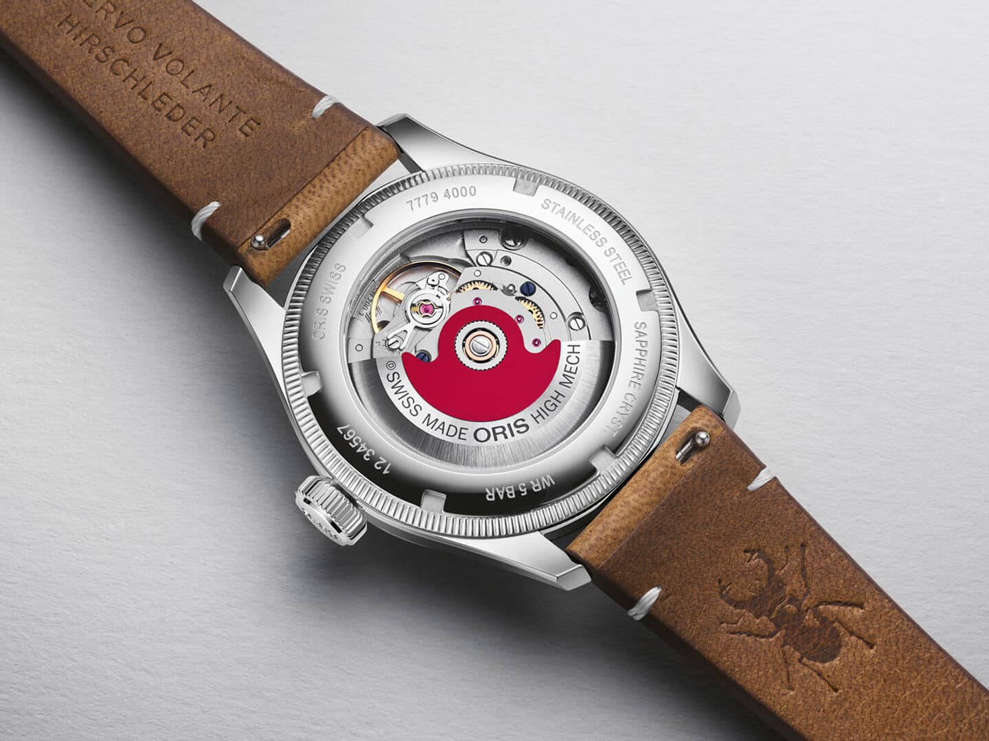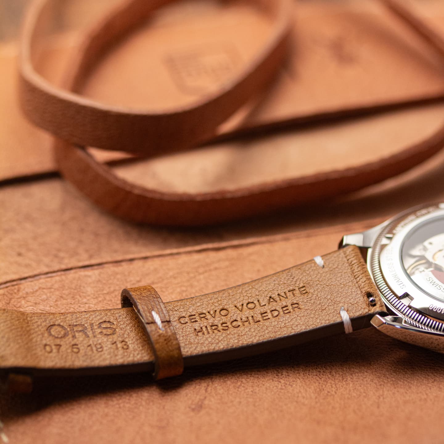 スイスでは毎年1万5千頭の鹿が有害駆除されておりますが、駆除された鹿は廃棄物として処理されておりました。そんな廃棄されていた鹿の革を有効利用して美しくて丈夫な靴や小物をつくろうと思い立ったのが「チェルボ・ボランテ」。オリスの「より良い変革をもたらす」ための取り組みを知り、サステナブルな鹿革を使ったコラボレーションを提案し、オリスはそれを歓迎しスタートしたのがこちらのモデルです。チェルボボランテの環境にやさしい手作りの製品とその理念をオリスは高く評価しており、製品の美しさだけでなく、大量生産にはない物語に心を動かされたタイムピースです。